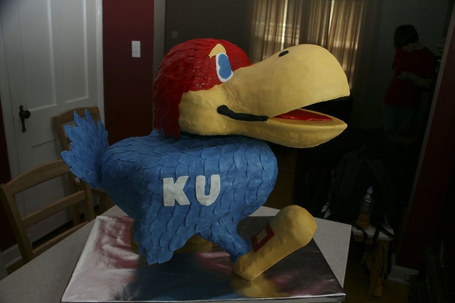 Being a K- state fan, this was a challenge... He has a wood frame, covered with rice krispies on the bottom half and cake, obviously, on the top. It made for an easy split on flavors, his head was one and the body was the other. Then good old fondant. all the feathers were a lot of fun to cut out and attach individually with a leaf cutter, but it looks a lot better, i think.