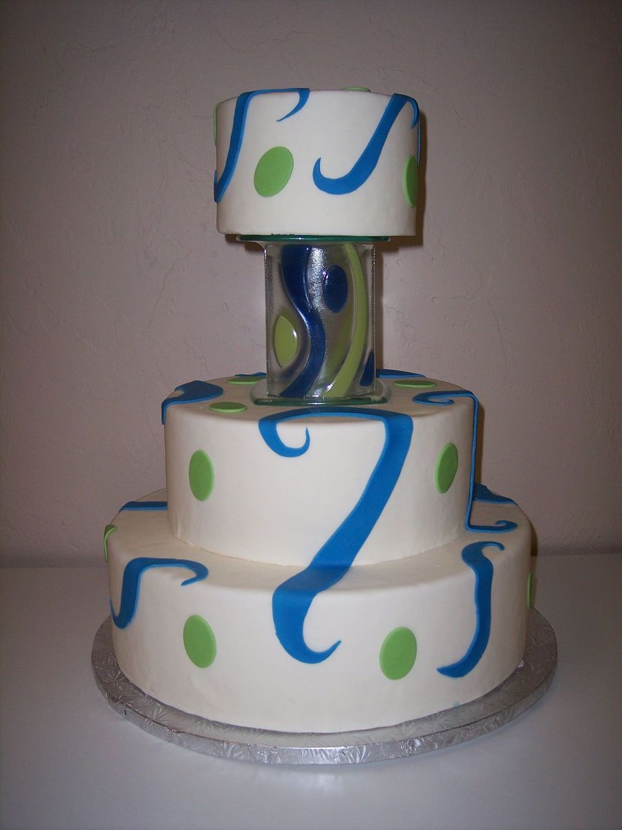 The "separator" for this cake is actually a glass candle holder that I found at a thrift shop. I thought it was a neat design so I designed a cake around it. I've duplicated it several times & it has actually turned out to be one of the most popular designs with my clients. Funny....all from a trip to the thrift store!
