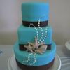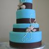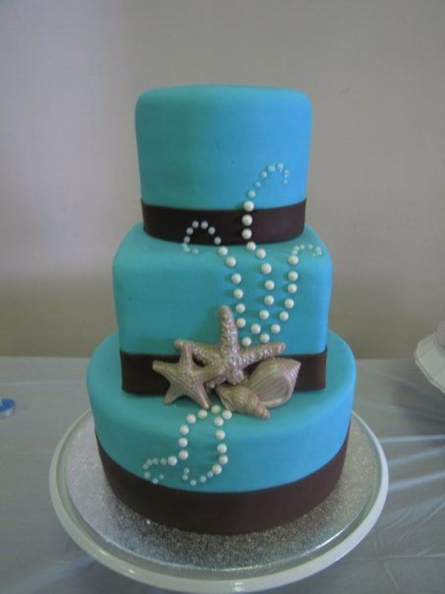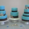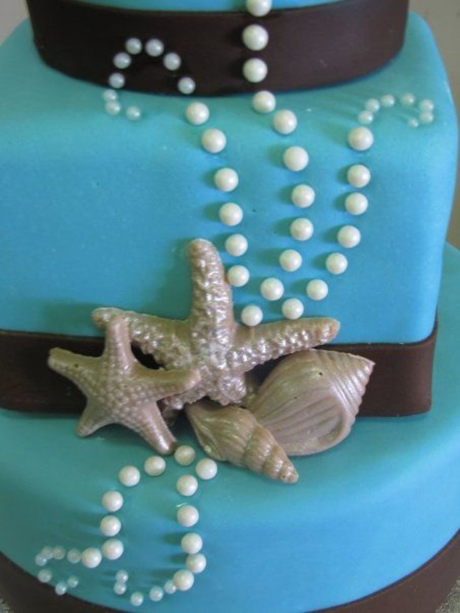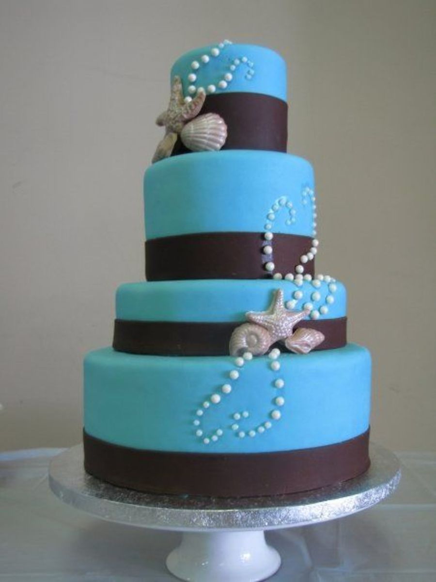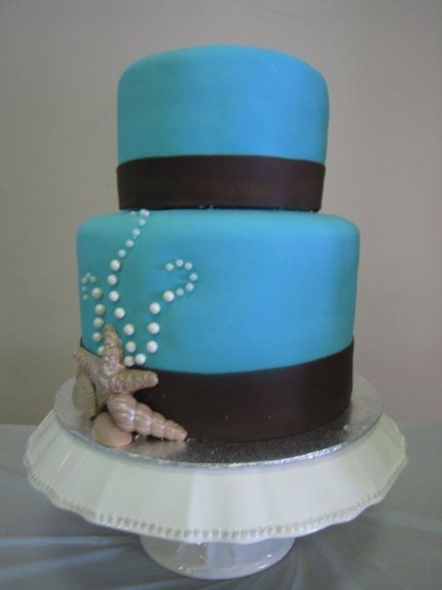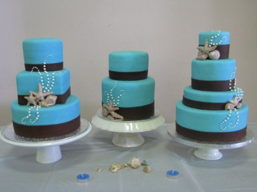 I made this series of cakes for an acquaintance of mine. Her wedding was to take place in Mexico but was cancelled because of the swine flu. I told her that if she needed to throw together a last minute wedding I would help out by making her a cake. She ended up getting her wedding moved to Hawaii but decided to have a bigger wedding reception when she got back as the wedding in Hawaii was very simple. She asked me to make her a cake anyway, but would pay for it. I made a deal with her that if she let me do whatever I wanted (going along with her colors and theme of course) I would only charge her half price. I had wanted to do a series of smaller cakes so thats what I did! All the cakes are covered in MMF with chocolate fondant ribbons, edible pearls and white chocolate (with a hint of milk chocolate) sea shells dusted in pearl dust. The sizes are (from left to right) 5" round, 6"square, 9" round - 6" round, 8" round (6 inches tall) - 4", 6", 8" (2" tall), 10" rounds. I was up the entire night before with this one but I love how it came out. TFL!