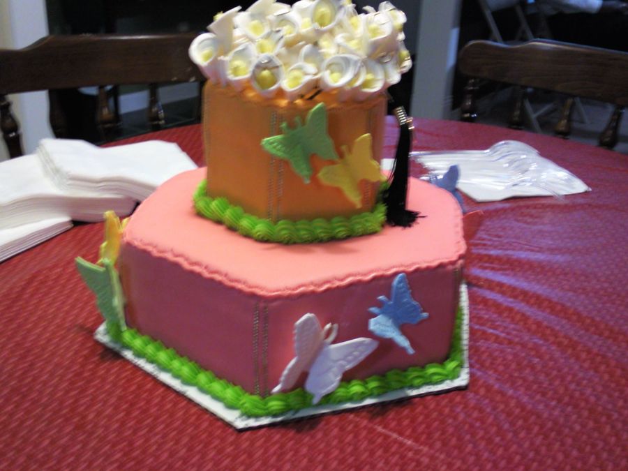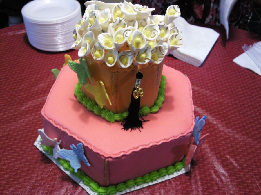 Made this for my neice as a gradution present..Its a 2 tier stacked cake- it was chocolate and yellow cake with a milk chocolate ganache filling and covered in fondant. The callalillies were embossed and painted with luster dust and handmade the butterflies.