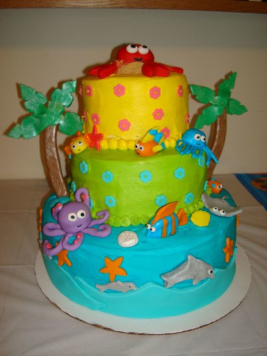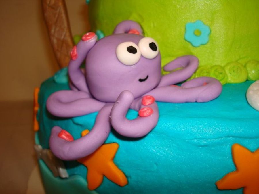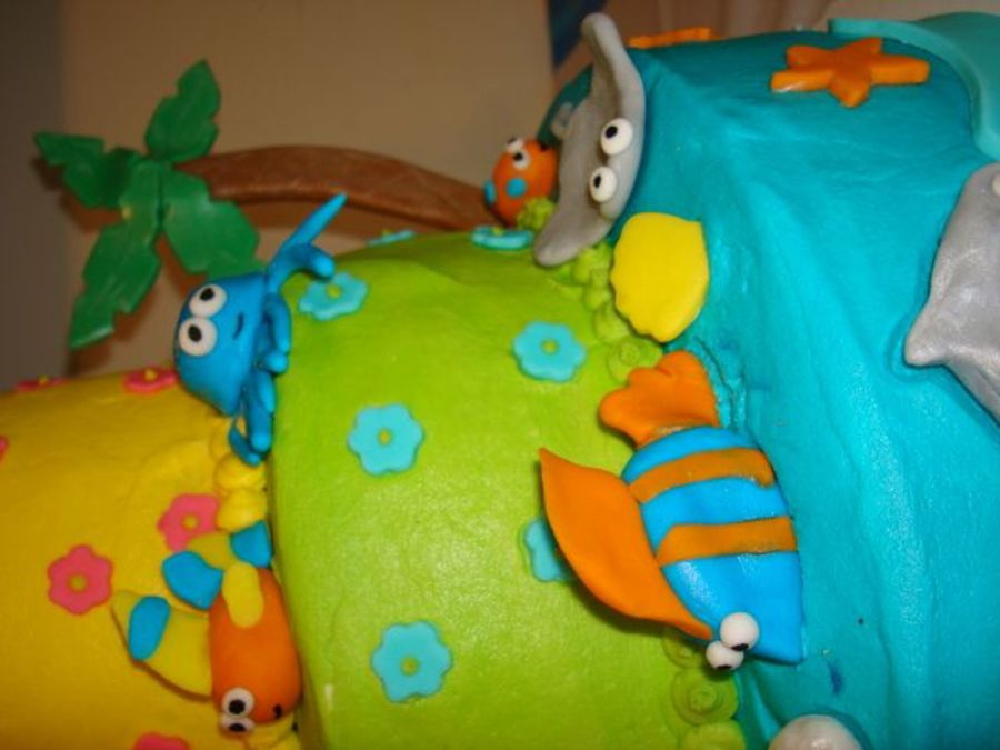 Beach themed birthday cake for my 7 yr. old, it was my first time making a 3 layer cake or using fondant/gumpaste. Cake is chocolate chip cookie with ganache filling, butter cream icing and fondant/gumpaste figures. Thanks!