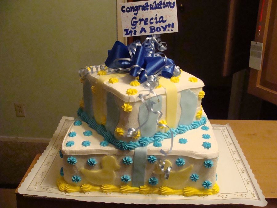 BC icing on a 10" and 6" square cake. I used cookie cutters and fondant for the feet and other decorations on the sides.