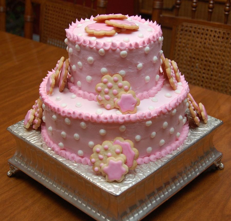 Cake was made for twin baby girls. Pound cake with butter cream icing. Cookie accents with royal icing.