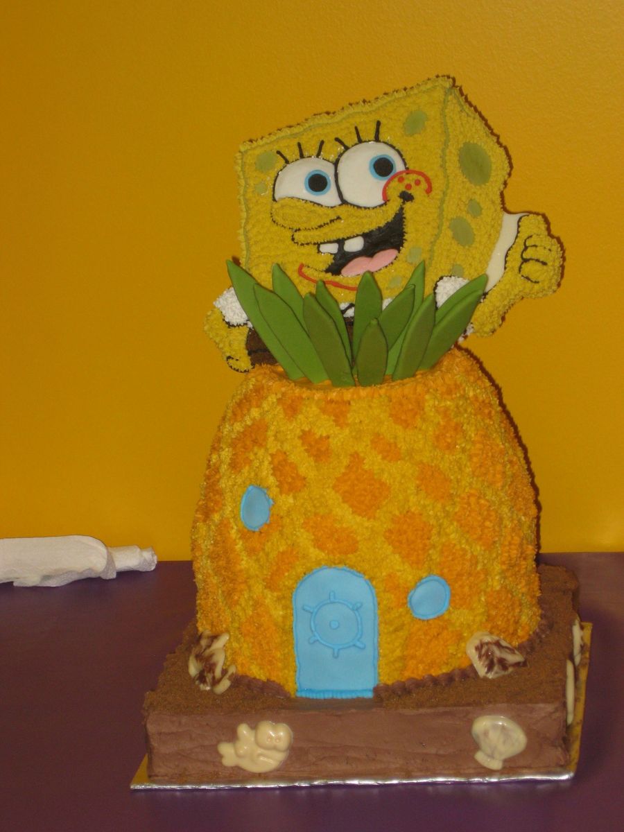 Pineapple made of cake - covered with buttercream. Spongebob made of candy melts - decorated with royal icing.