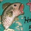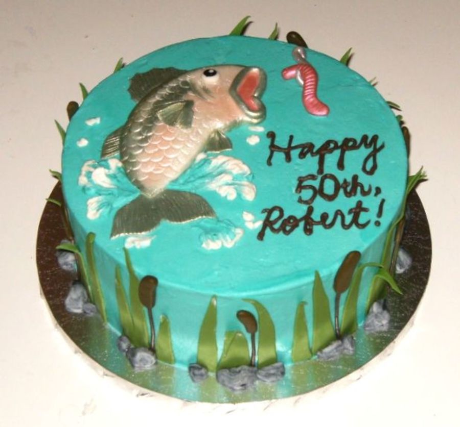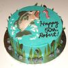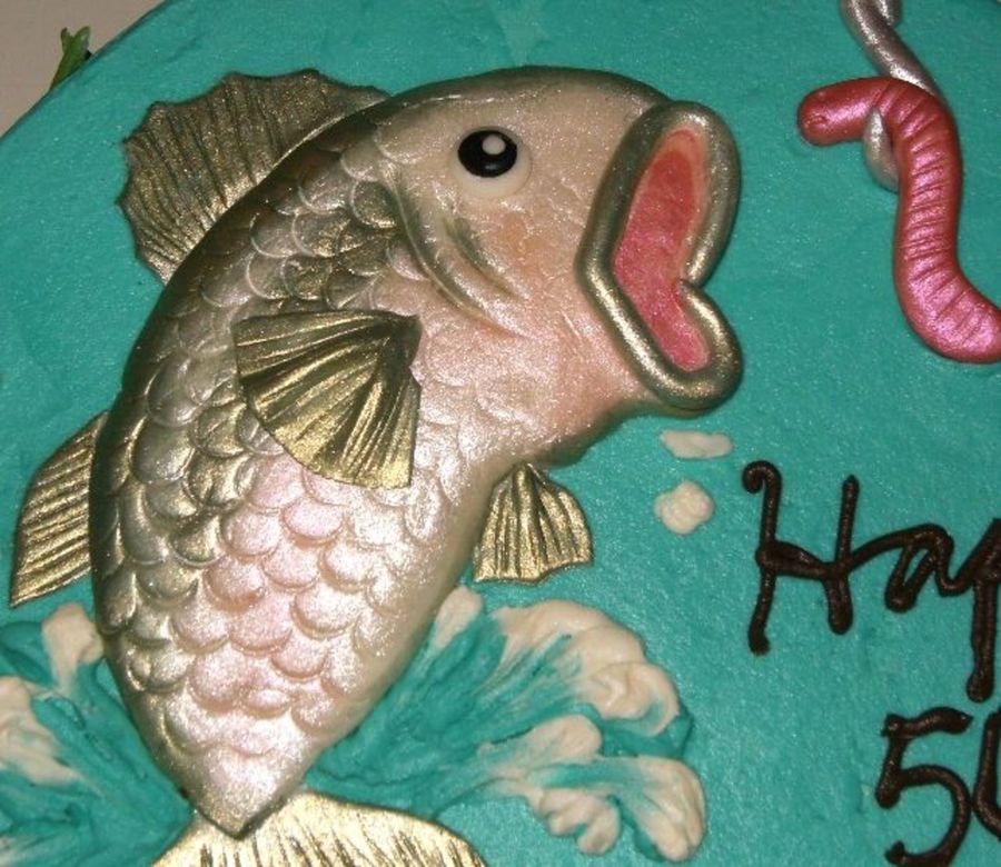 a 10" cake iced in buttercream with fondant accents. Fish, worm, and hook are painted with luster dusts