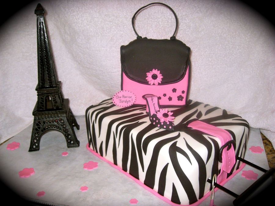 fondant covered to look like suit case. Eiffel tower is a statue. Made for cousin who was moving to france.