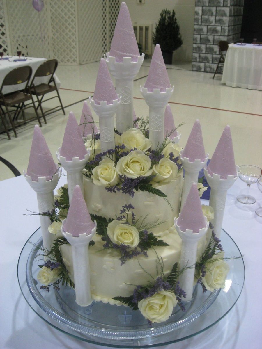 6 and 10" round with wilton castle kit and fresh flowers. Piped on brick accents.