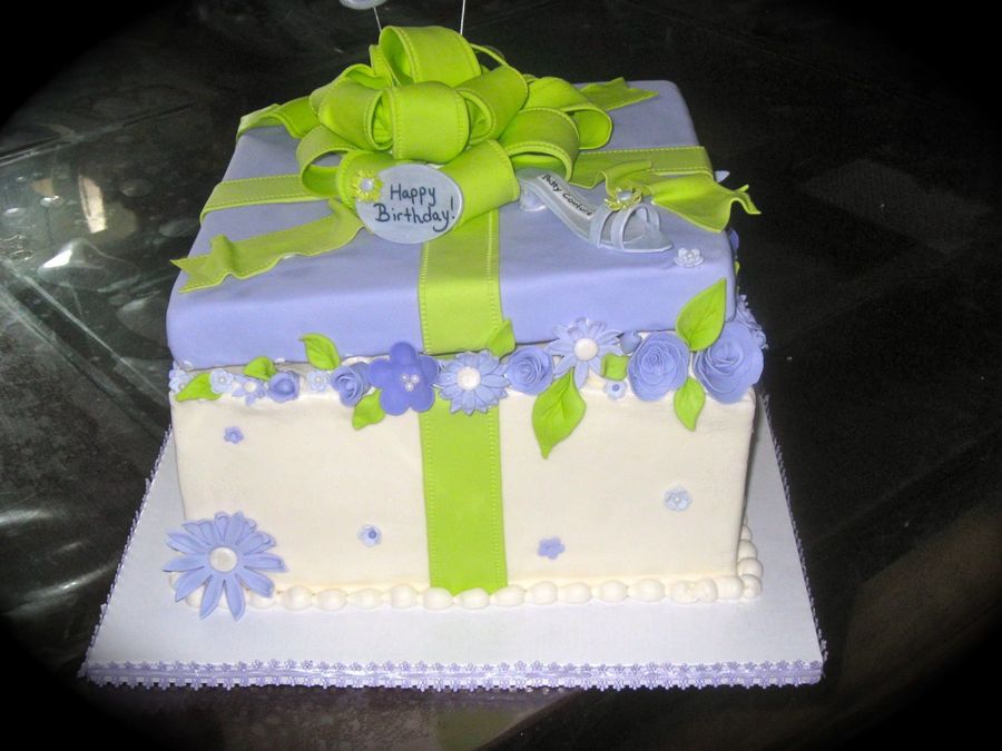 made for 50th bday. lavender and lime green, lid is styrofoam covered in fondant