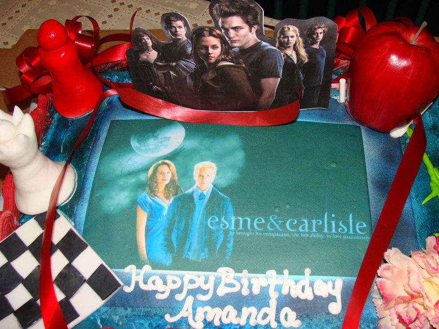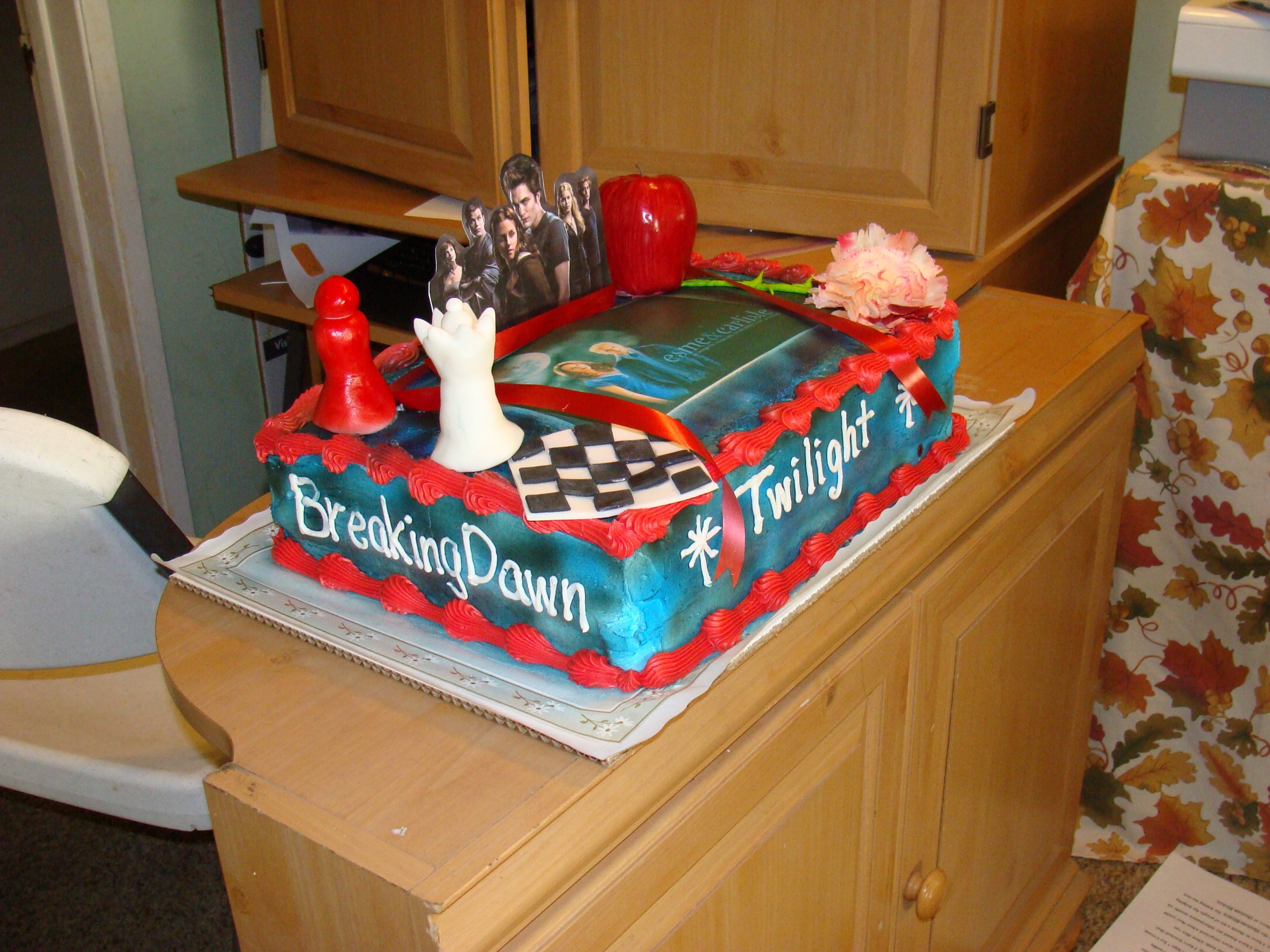 For my daughter, this is her favorite cake and a favorite of almost all of her senior classmates! 1/2 sheet chocolate cake with buttercream icing. I made all of the toppers with fondant and the apple was plastic. Her birthday party was "Twilight" themed, and we had fun with the cake.