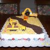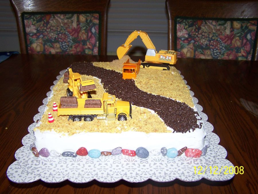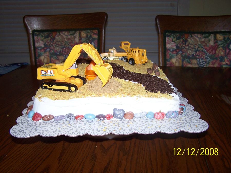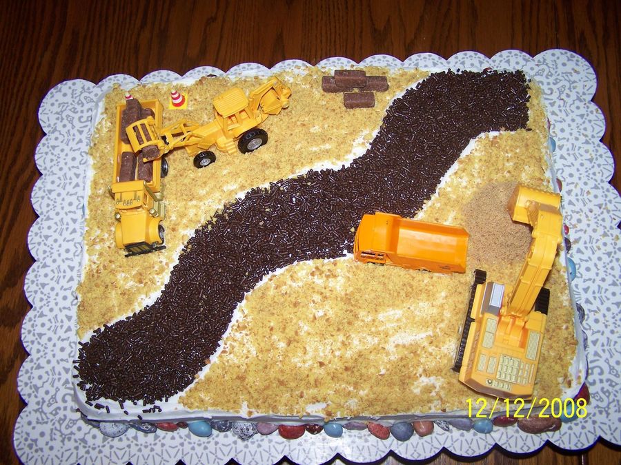 This was done for a one year olds birthday. Everything is edilble except the toy tractors and trucks. This was a yellow butter cake with bc frosting. The road is chocolate perils, the little "logs" are mini Charleston Chews, the dirt is ground up vanilla wafers, the "saw dust" is brown sugar with cinnamon (keeps the bs from clumping together), the "rocks" was candy coated chocolate. I really had a lot fun doing this cake.
