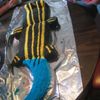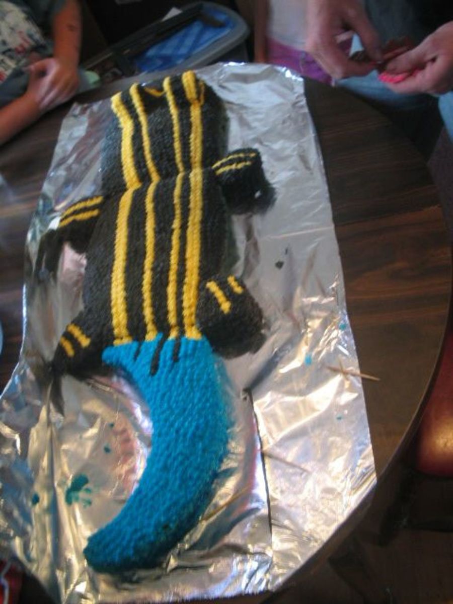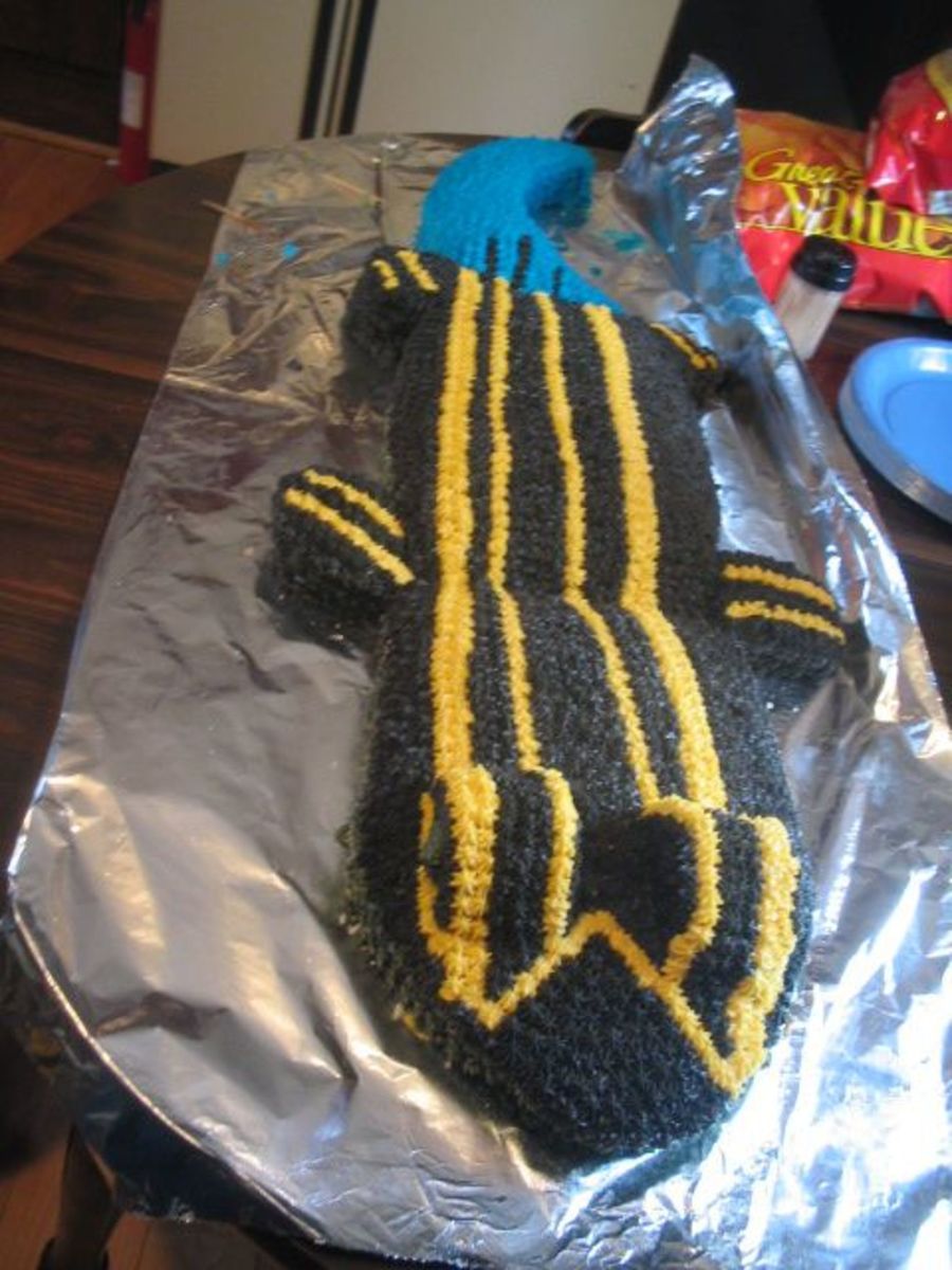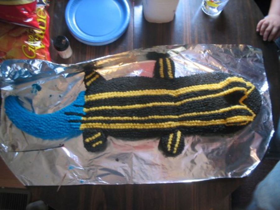 This is a Blue tailed lizard I did for my son's 7th b-day. He loves to catch lizards & all kinds of creepy crawlys. I got the idea from a website. This was one of the most time consuming cakes I have ever done. He was happy with it so that was all that mattered. ( I thought it looked more like a croc lol )