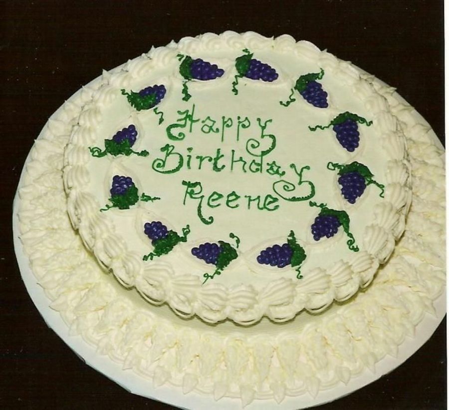 A single layer 9" round iced & decorated in buttercream. Placed on a 14" board so there is room for the elaborate boarder work. Lettering design from Mary Ford's book; basic grape design and borders from Lambeth's book.