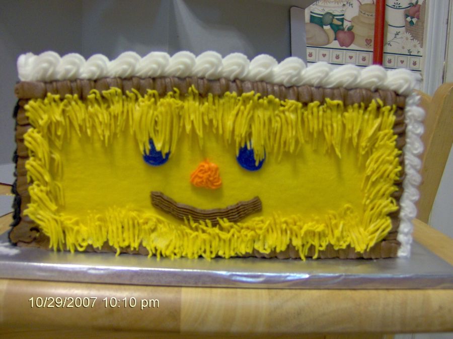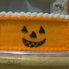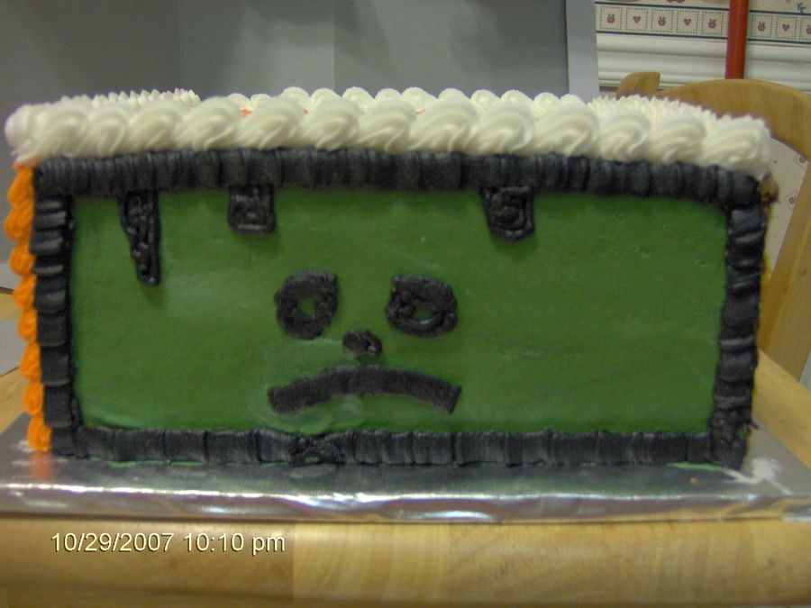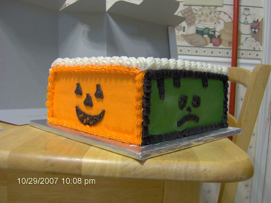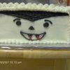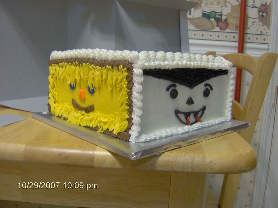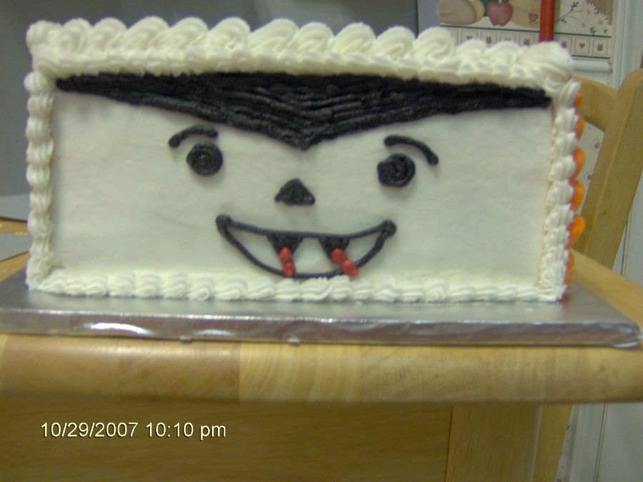 I did a different Halloween theme on each side of this cake. Dracula, Scarecrow, Pumpkin and Frankenstein. I wrote Happy Halloween on the top.