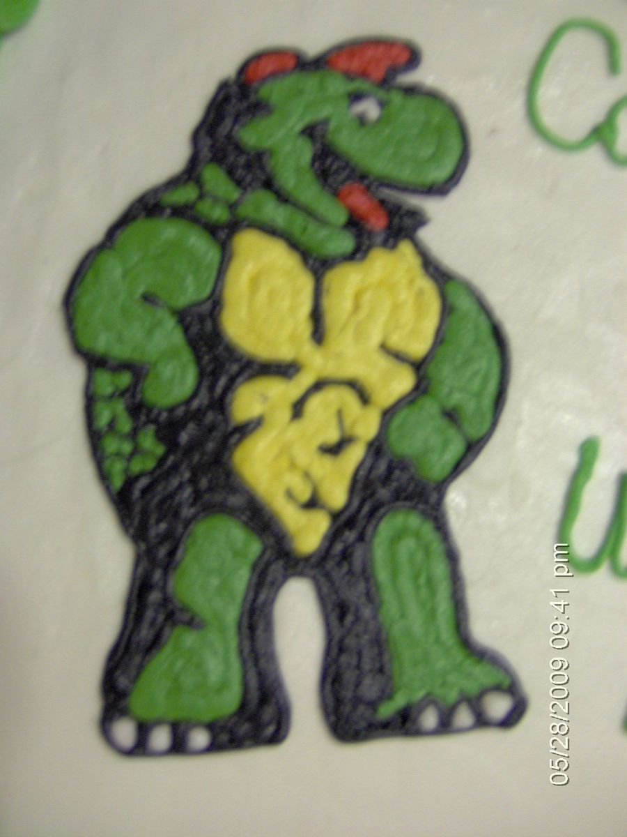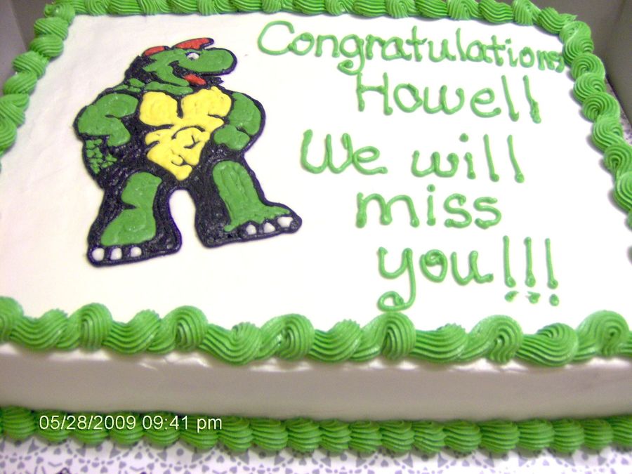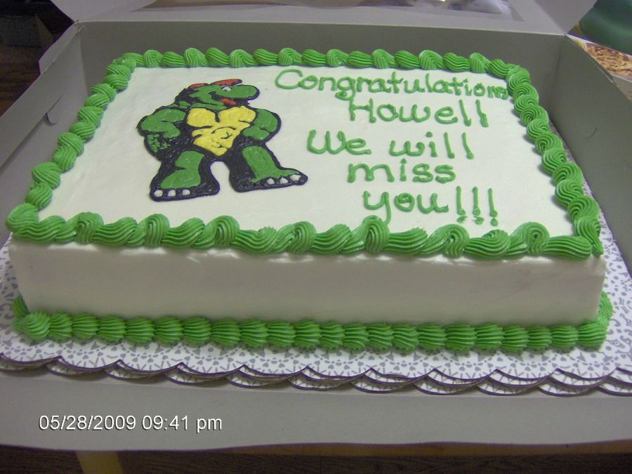 Retirement cake for co-worker today. Another Snapper turtle similar to my cake from 2005. I traced the turtle and tried the pin prick method, but the holes wouldn't show up, so the inside tracing was all freehand. Scratch white cake from Allrecipes.com, Buttercream Dream icing.