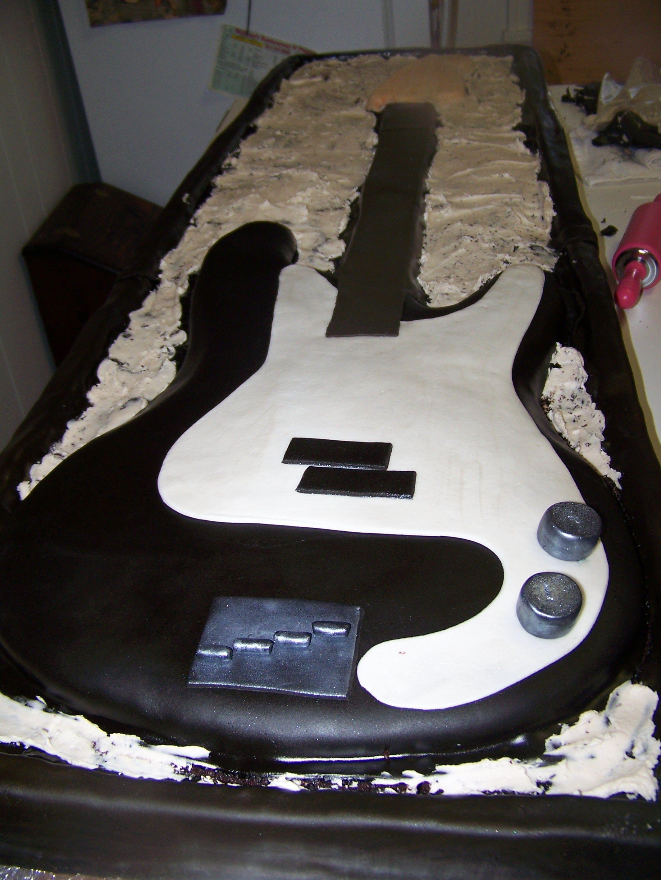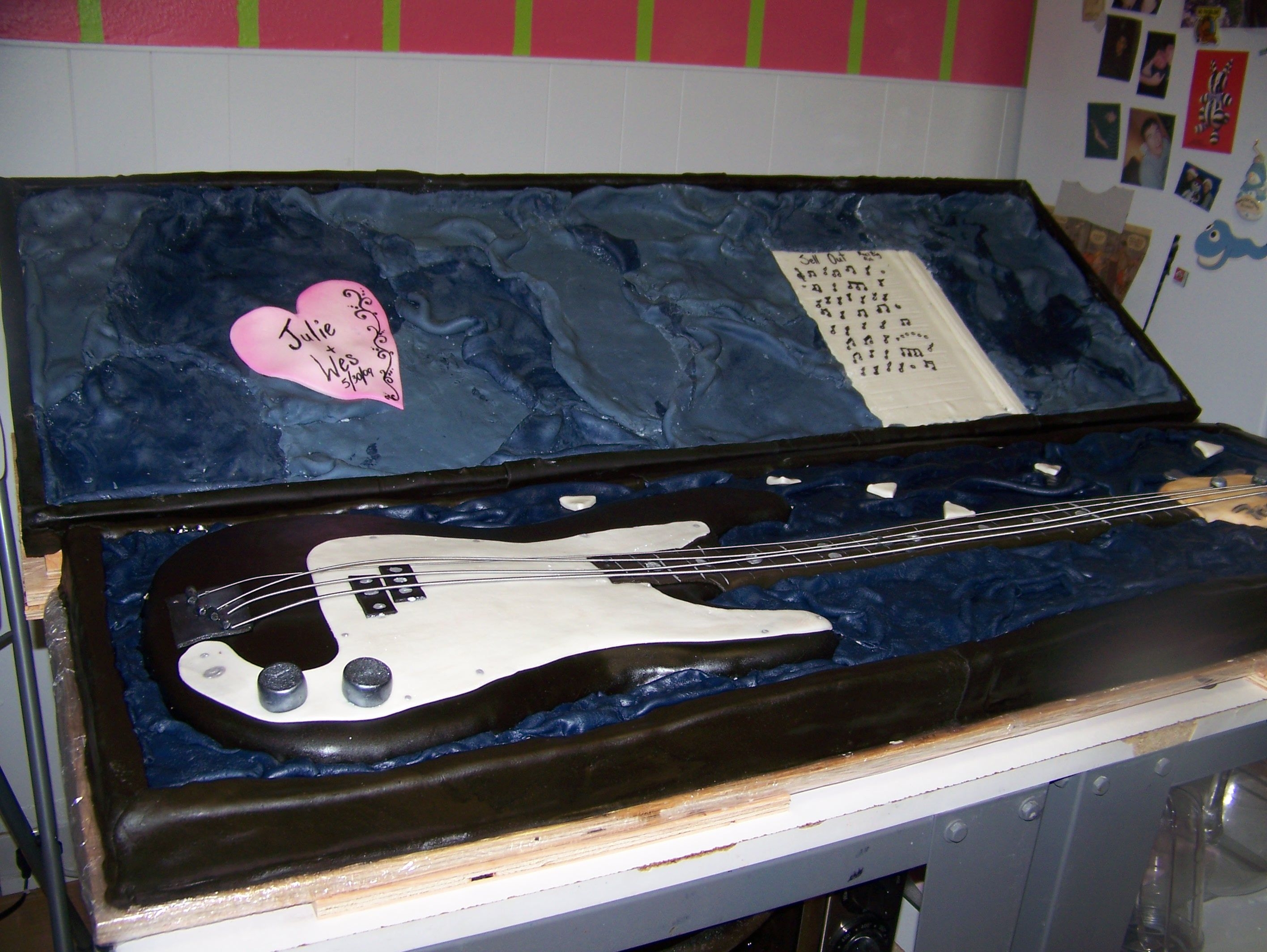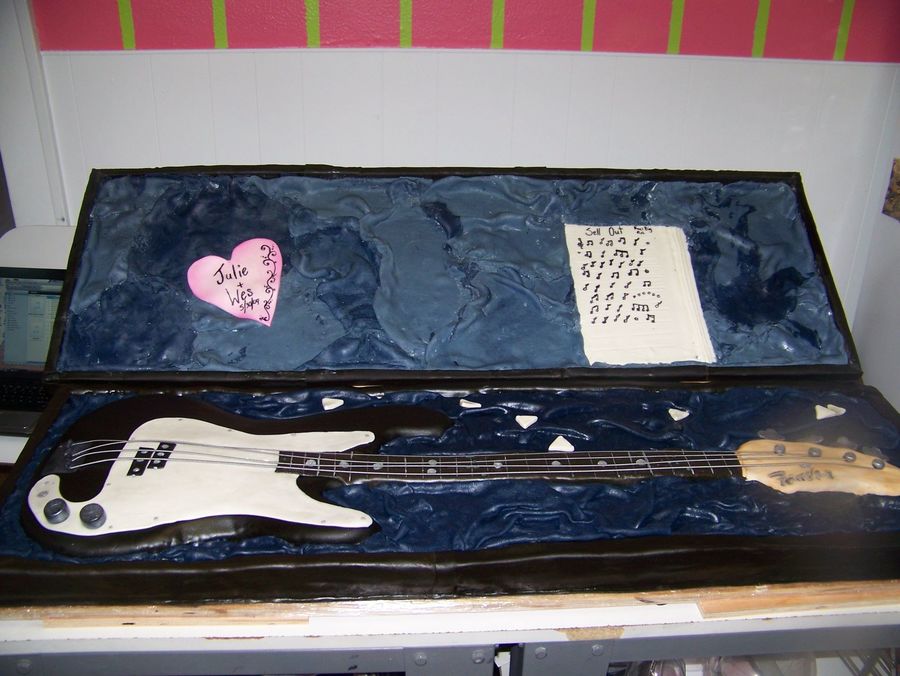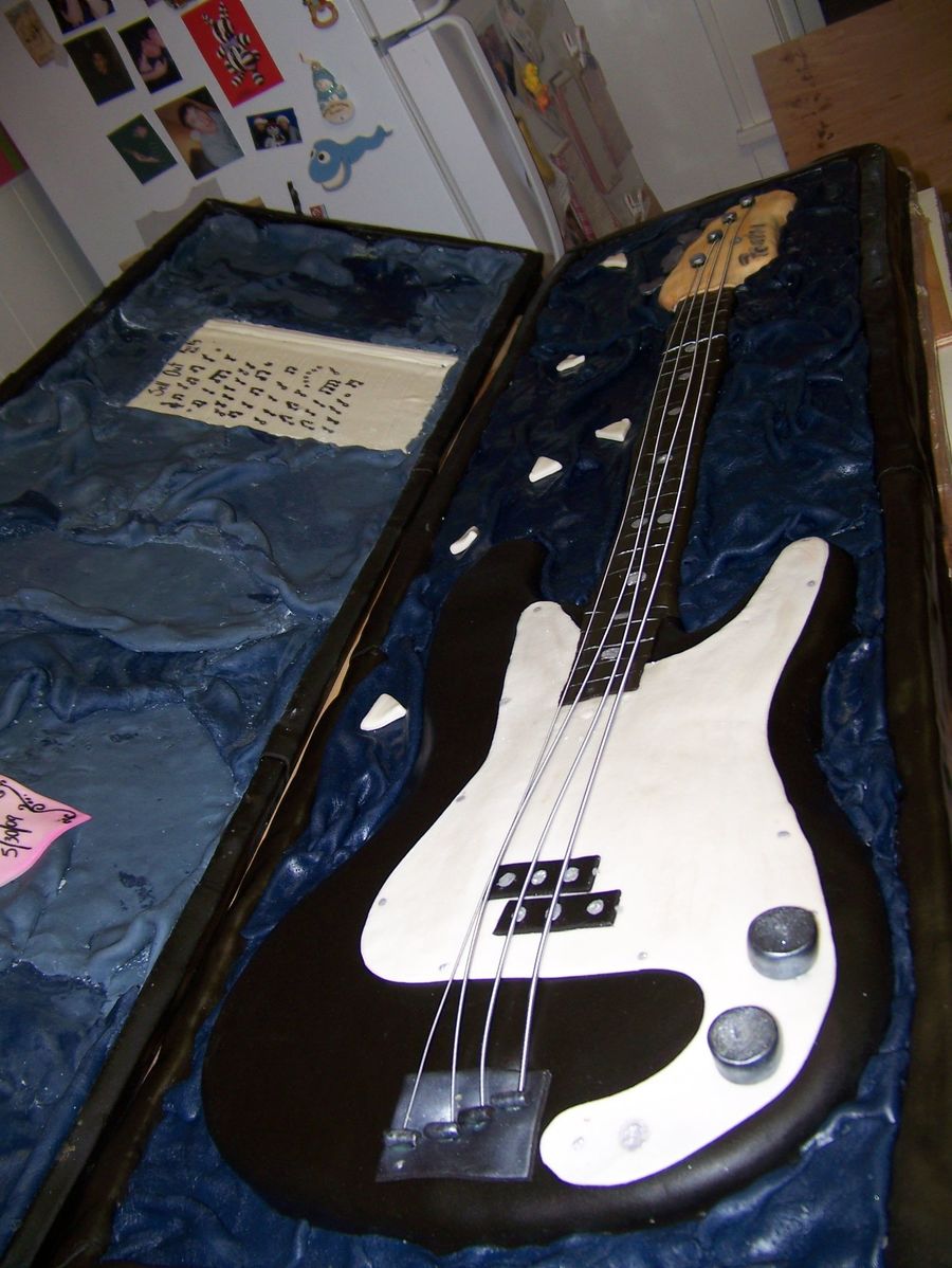 I made this cake for a friends wedding it was the grooms cake the cake was huge to scale it was 17" / 49" it was chocolate cake with a thin layer of nutelle and french vanilla BC. The bottom is cake and the top was fondant covered foam board . I carved it all out of sheet cakes, so its basically one layer of sheet cakes. the bass thats not in the case is the real one.
