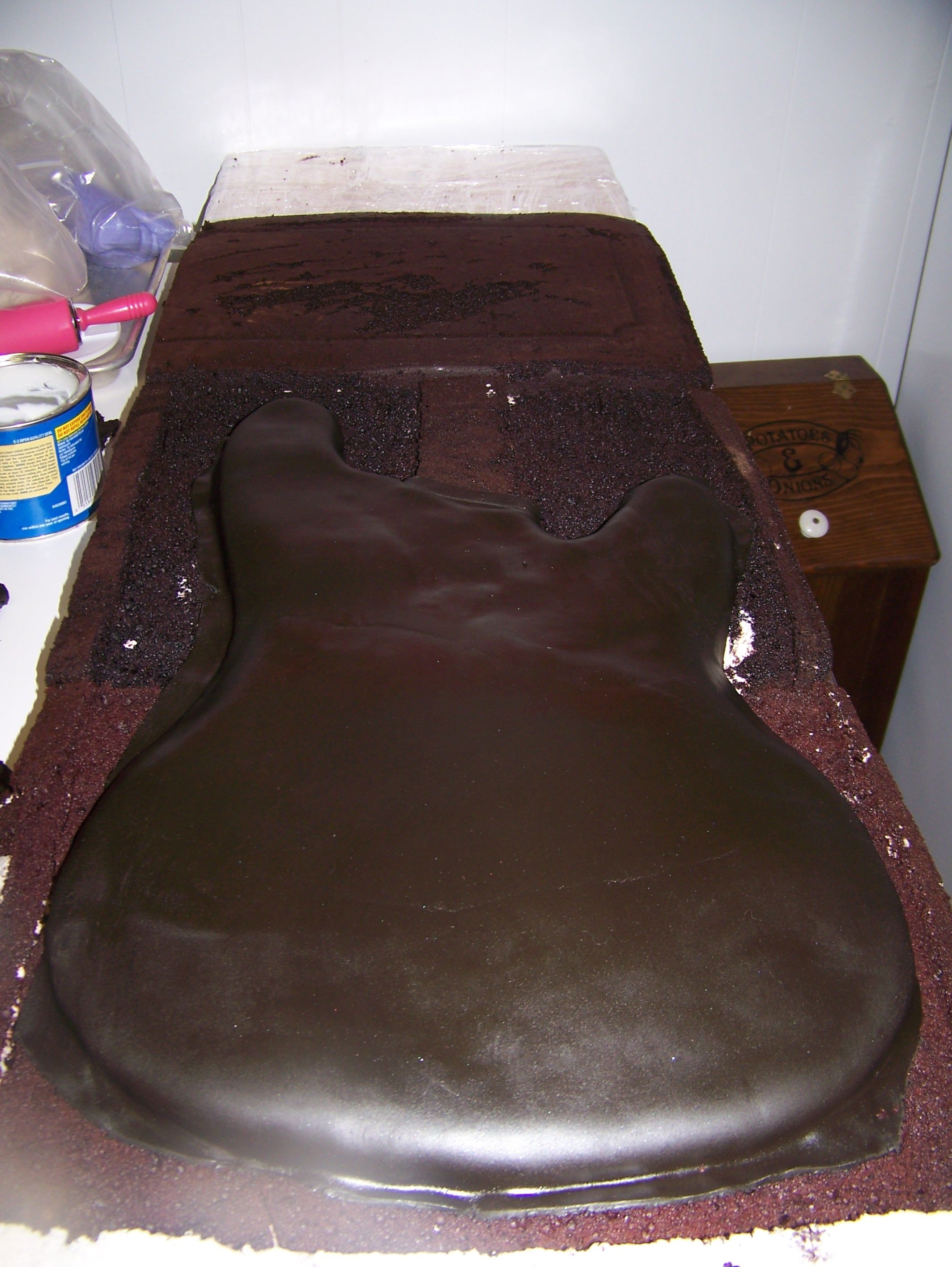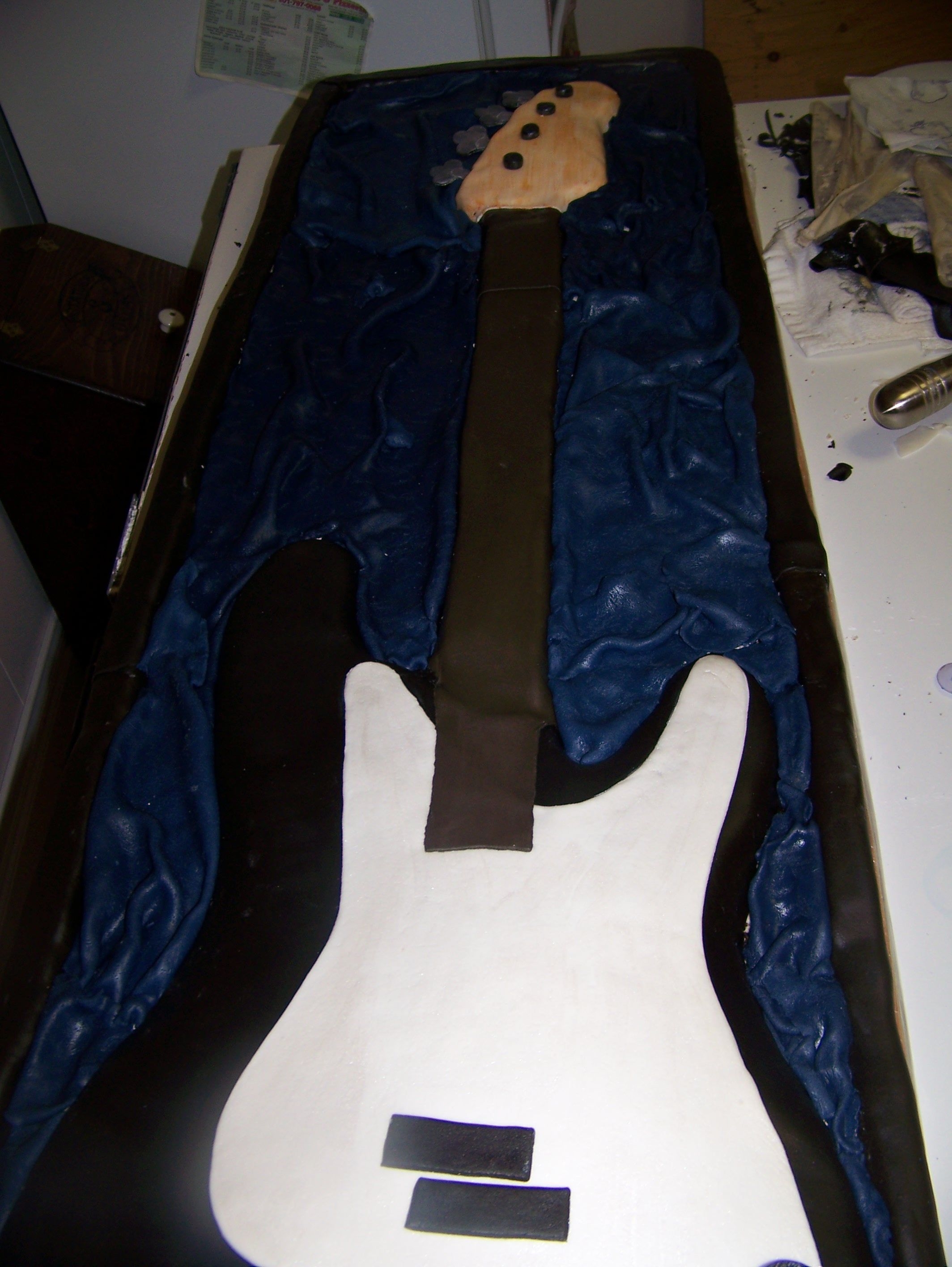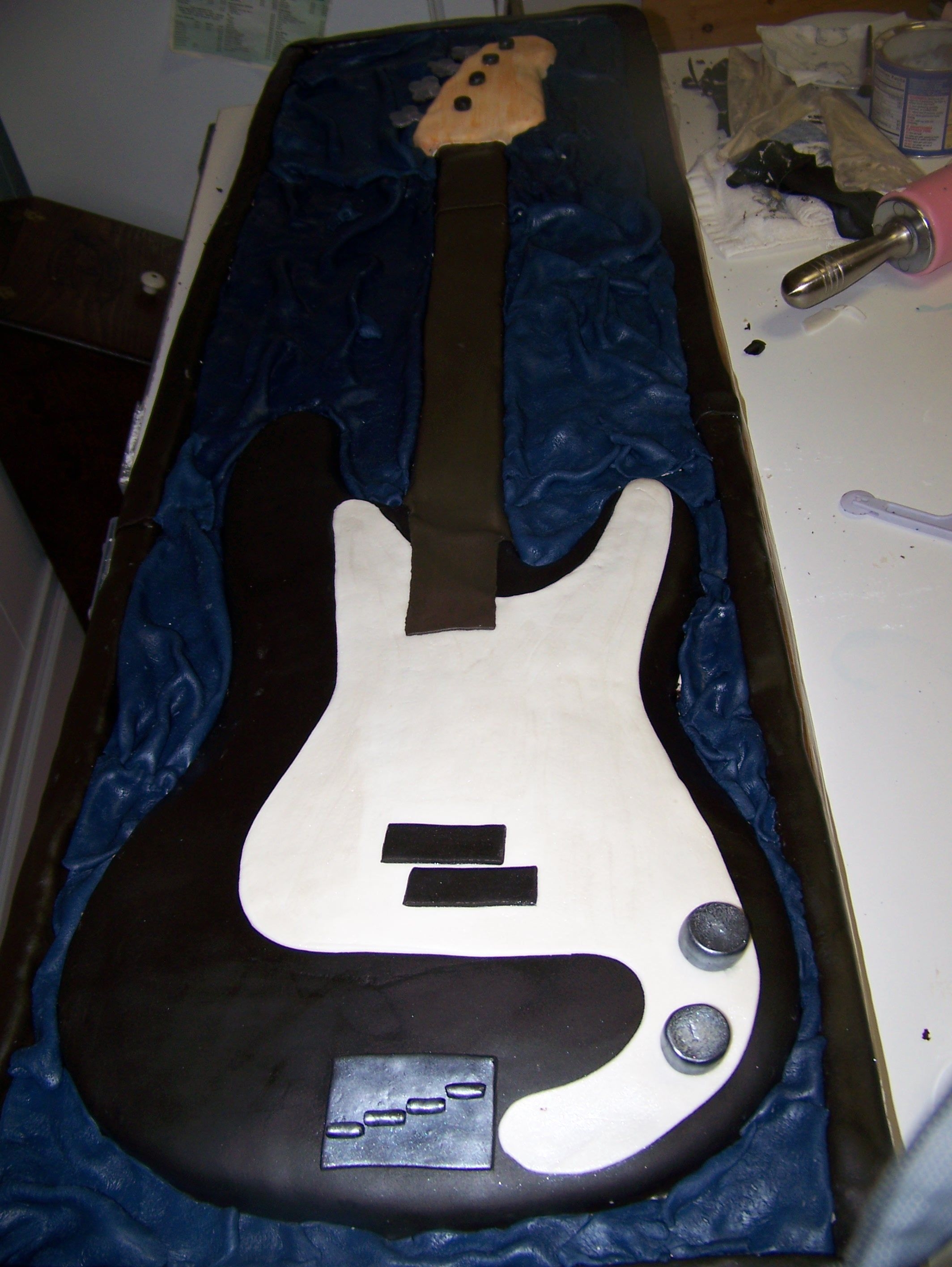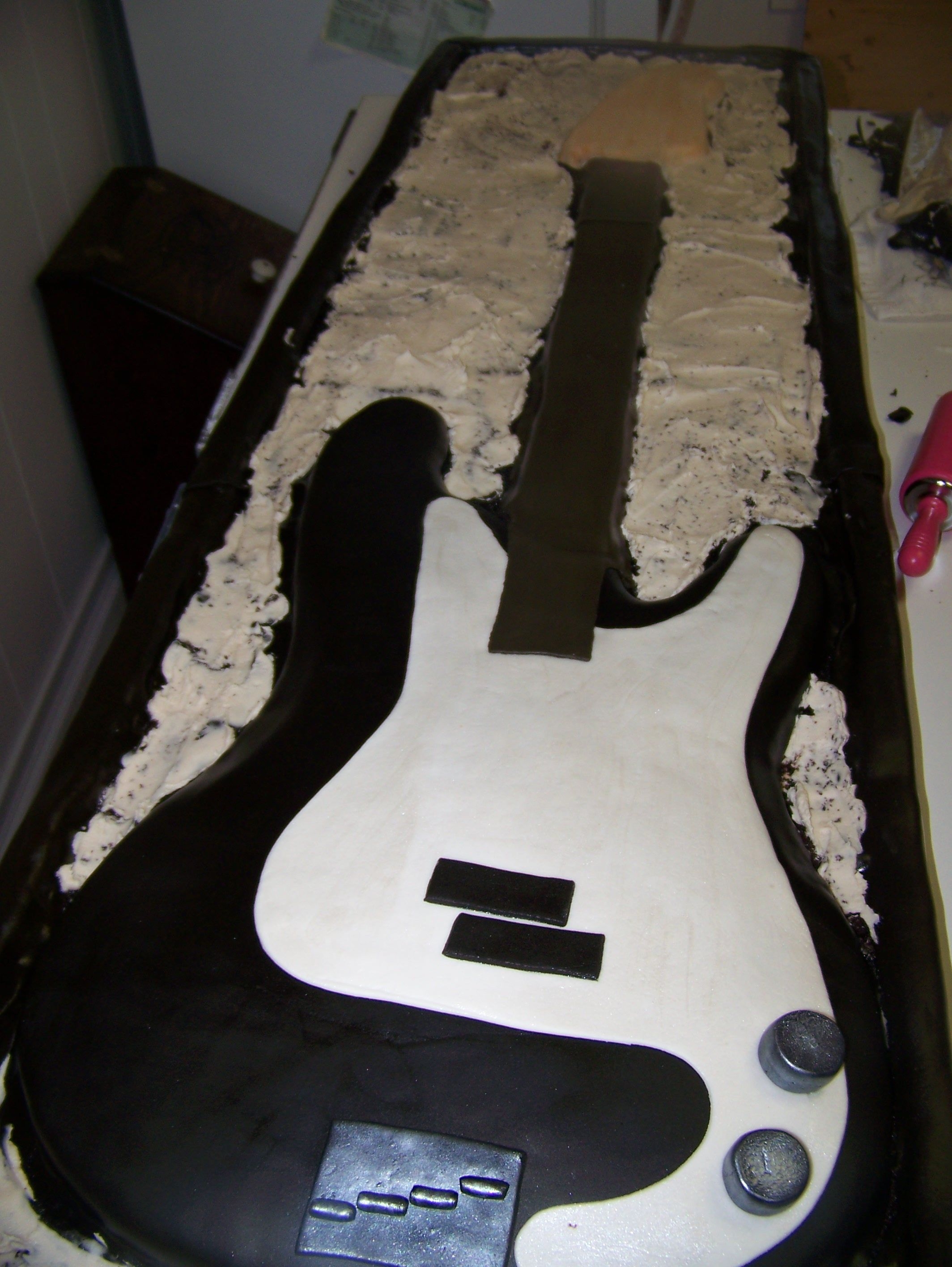 I made this cake for a friends wedding it was the grooms cake the cake was huge to scale it was 17" / 49" it was chocolate cake with a thin layer of nutelle and french vanilla BC. The bottom is cake and the top was fondant covered foam board . I carved it all out of sheet cakes, so its basically one layer of sheet cakes. the bass thats not in the case is the real one.