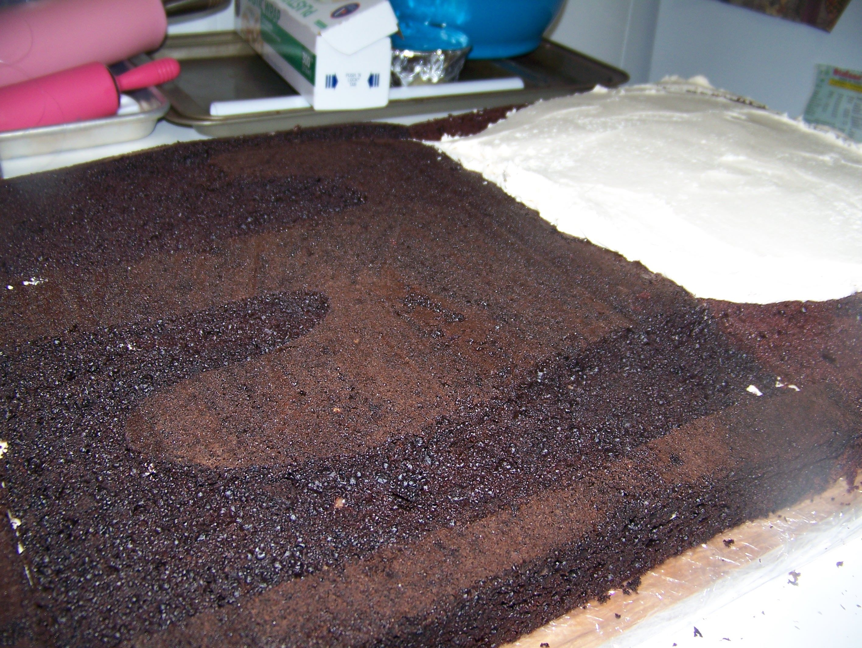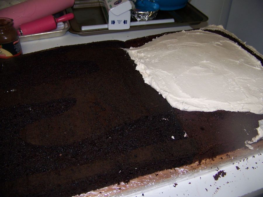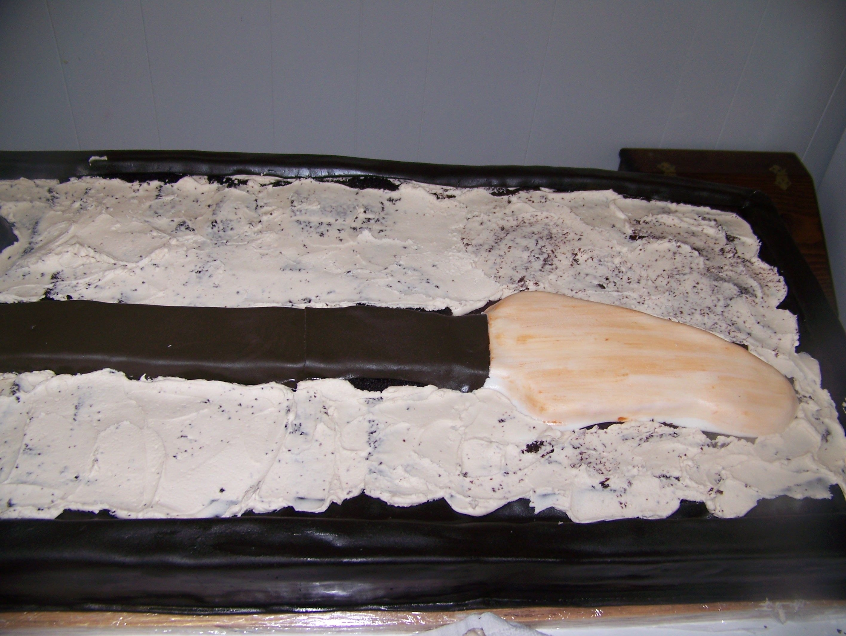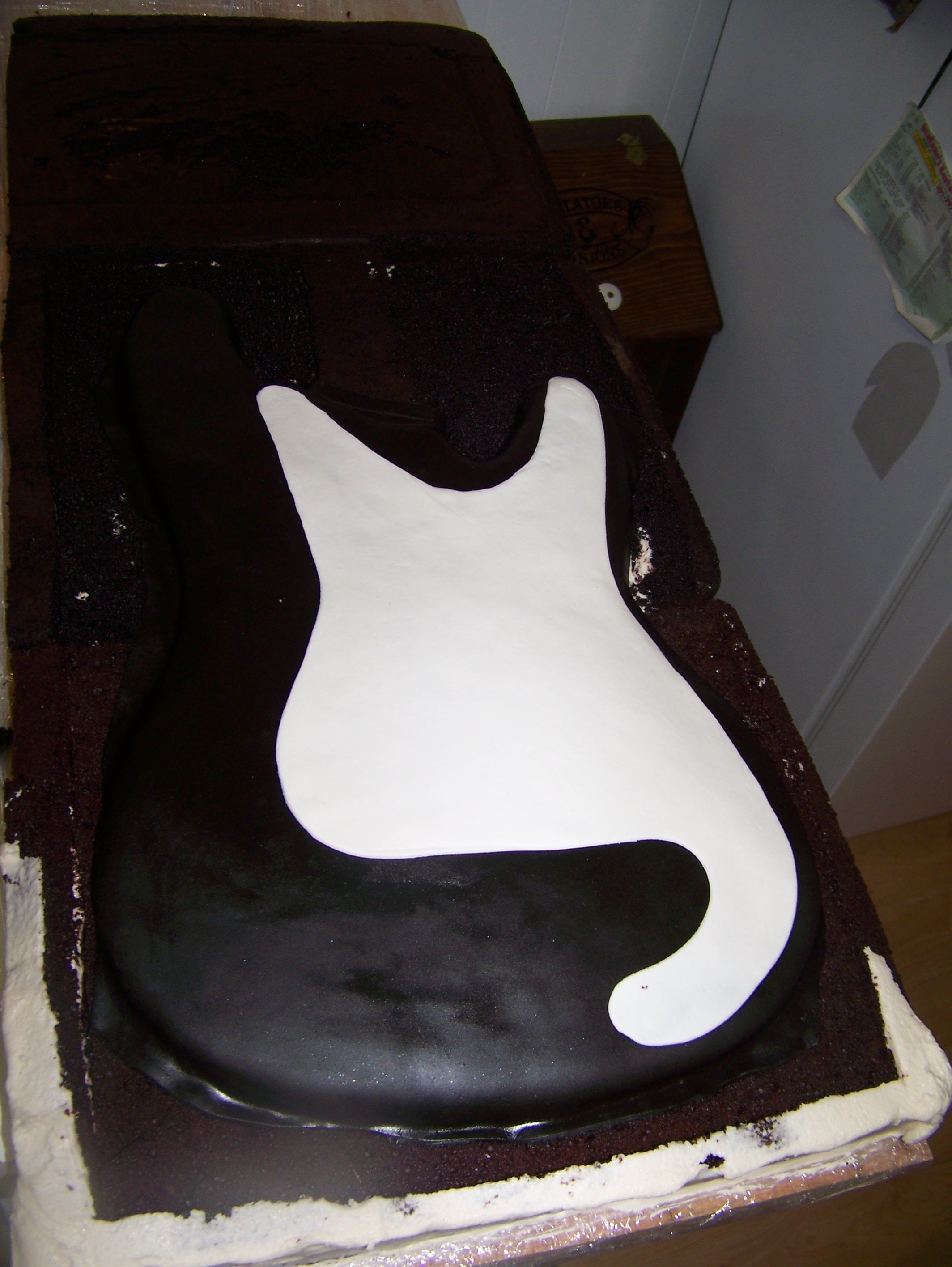 I made this cake for a friends wedding it was the grooms cake the cake was huge to scale it was 17" / 49" it was chocolate cake with a thin layer of nutelle and french vanilla BC. The bottom is cake and the top was fondant covered foam board . I carved it all out of sheet cakes, so its basically one layer of sheet cakes. the bass thats not in the case is the real one.