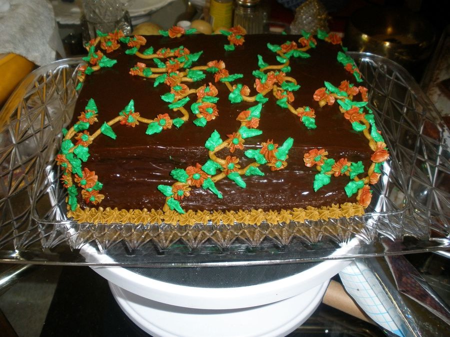 Chocolate torted with bavarian cream between the layers, covered with chocolate rum ganache and decorated in buttercream vine and flowers