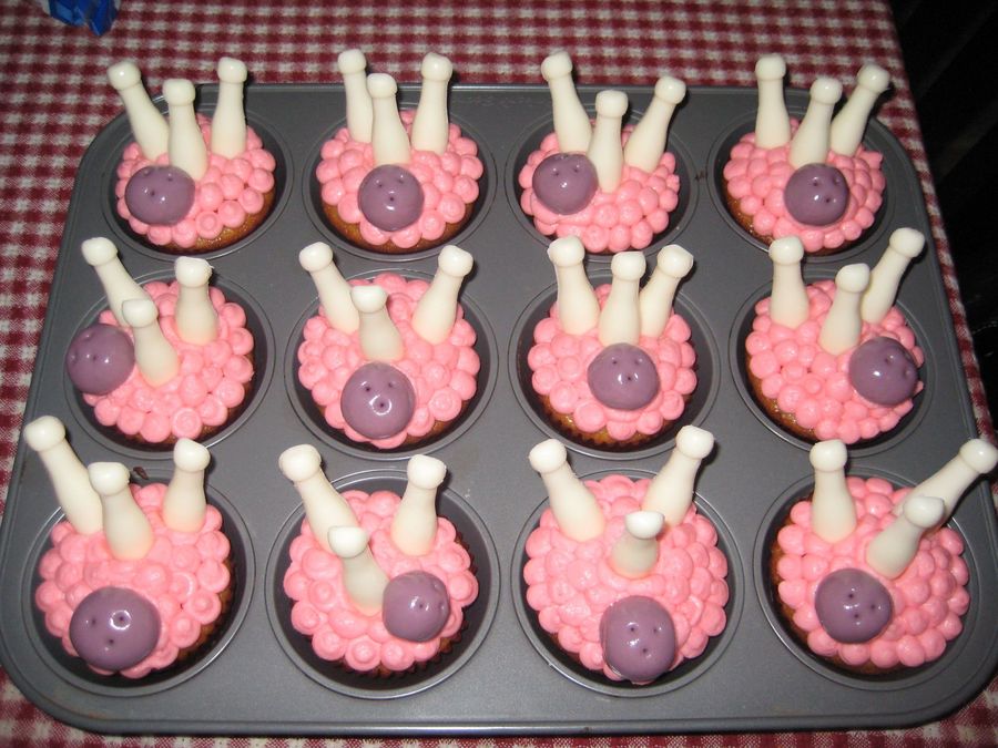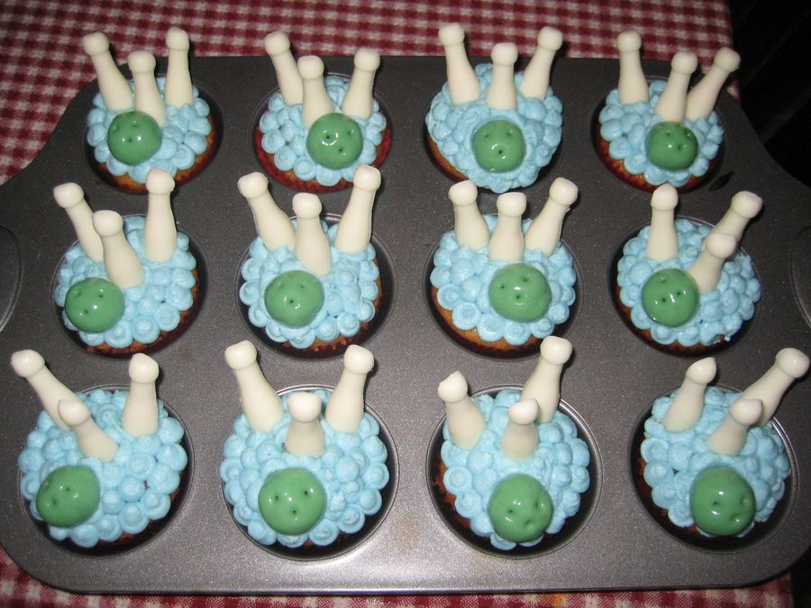 These are cupcakes I made for my cousin's daughters bowling party birthday. The pink is buttercream, the pins are candy melts and the bowling ball is fondant. I also made them in blue buttercream