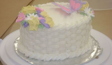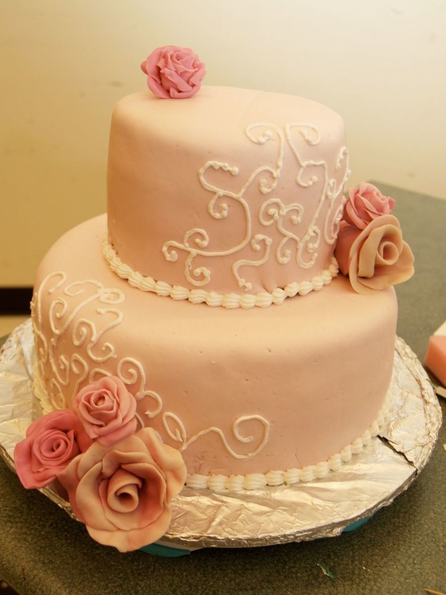 Inspired by a photo on Flicky, but I can't remember who it was. I didn't like the designs in the course book, so I made my own. The big roses were just me messing around - I had no clue how to make true gumpaste roses. :) I'm taking a course on that today, actually.