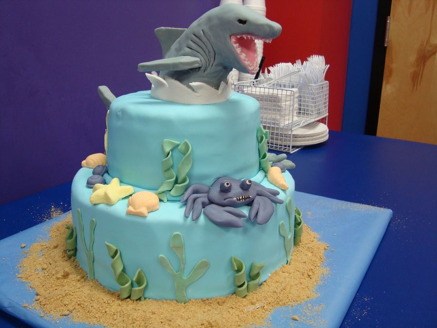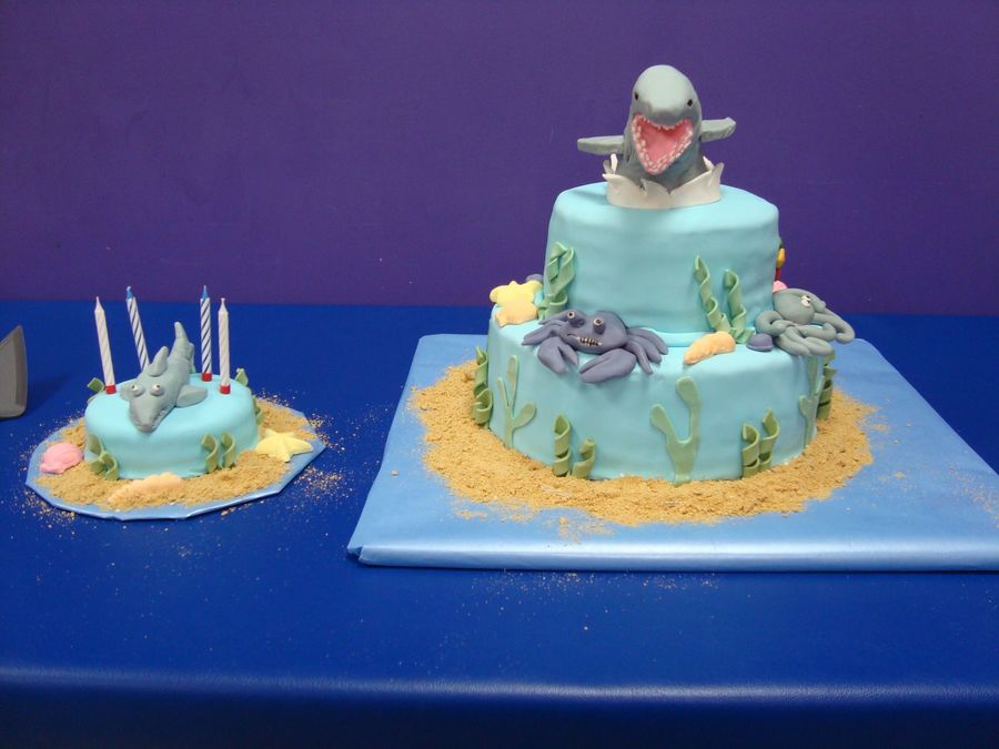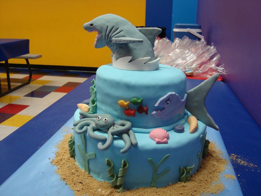 Made this cake fore my son's 4th birthday party. He requested a shark cake and after looking here for ideas this is what I came up with. A lot of heart and soul went into this cake. This was the first time making a stacked cake, making fondant figures, covering a cake in fondant (except for the one cake in Wilton's Course 3), and working with RKT. The shark on top is RKT, everything else is fondant.