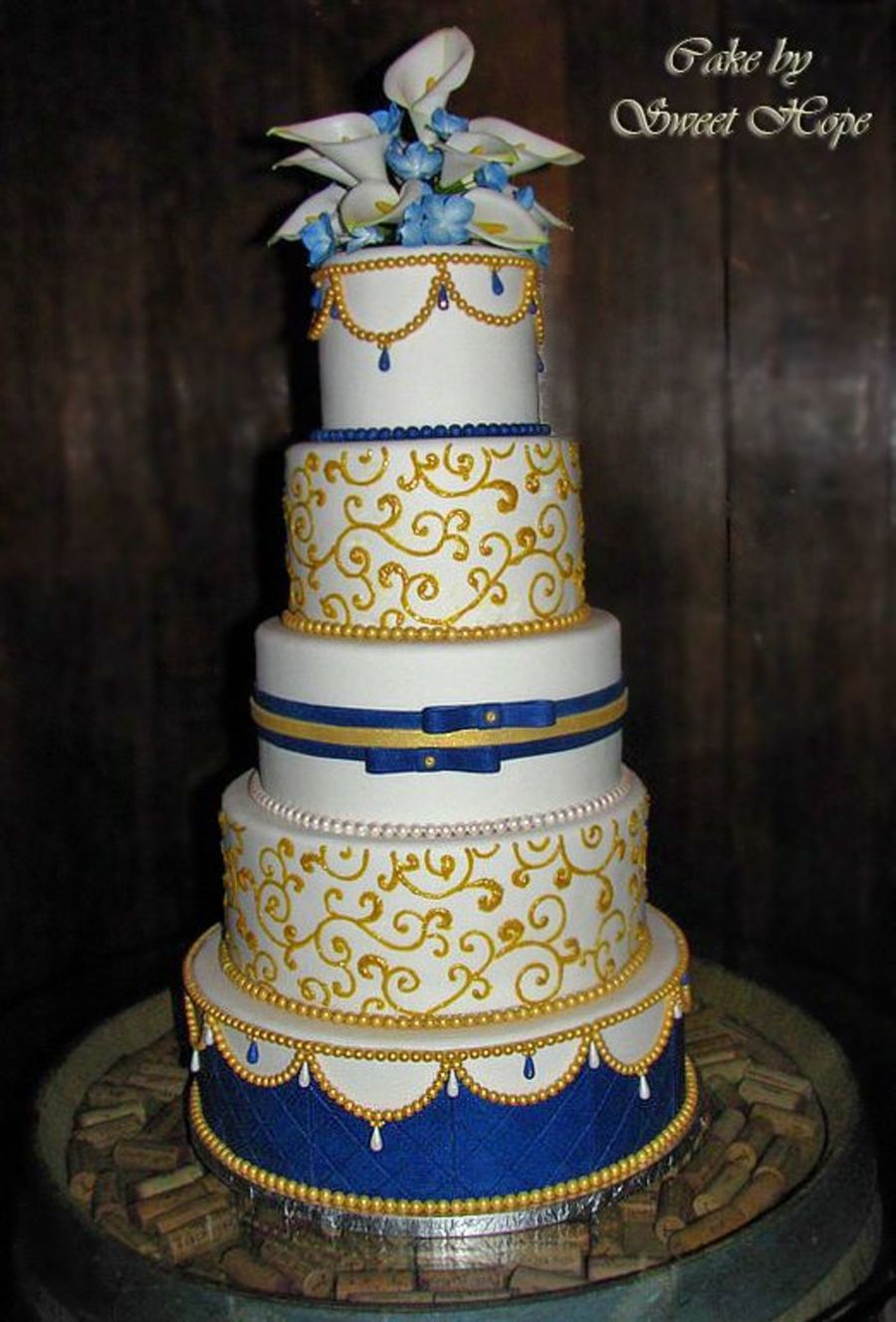 The wedding cake I made for my stepdaughter. The groom is a military man, so she wanted to incorporate blue and yellow in honor of that.