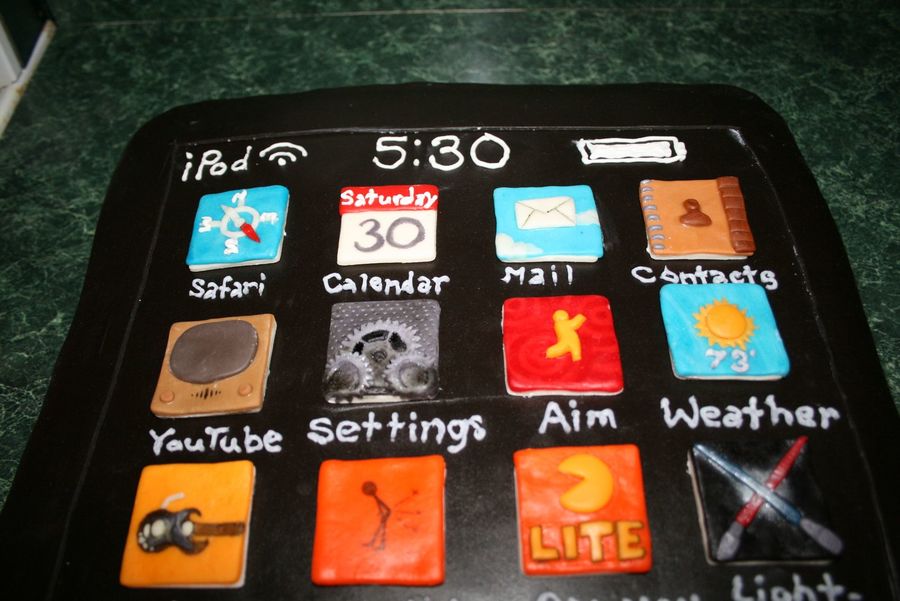 I made this for my son's 15th birthday. Yellow cake filled w/ caramel bananas & strawberry. Covered w/ Chocolate MMF. All apps made of MMF.