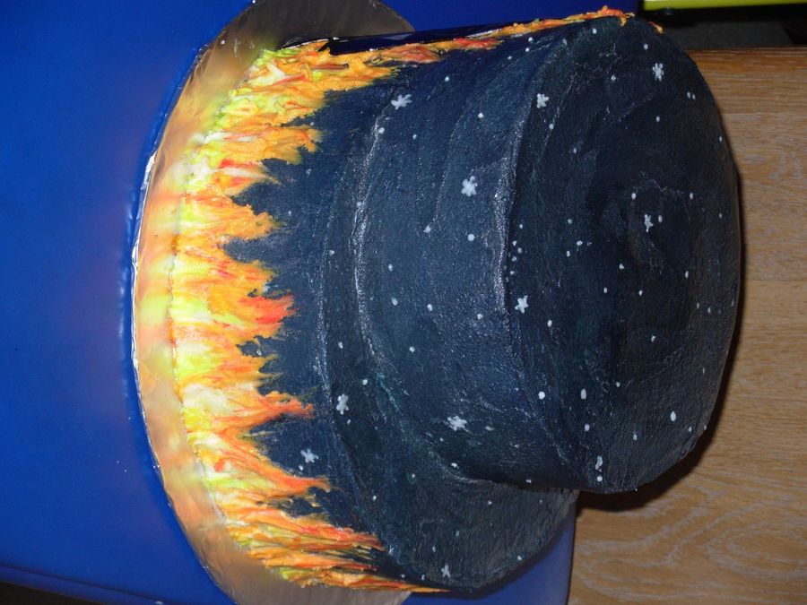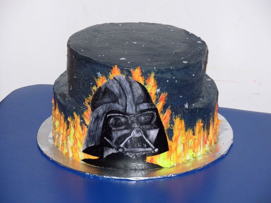All BC frosting w/ gumpaste darth vador. He is hand painted w/ food coloring on a piece of gumpaste.