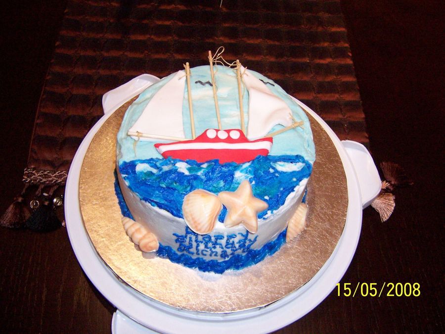 marble cake with chocolate hazlenut filling and buttercream dream frosting. Fondant boat, rafia rope and wooden skewers for masts. Moulded chocolated shells