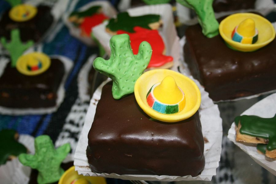 24 mini vanilla cakes with praline butter pecan filling, dipped in chocolate ganache for teacher appreciation luncheon. Sugar paste hand made Sombrero and cactus. Thanks to other CC decorators for the encouragement and ideas. TFL.