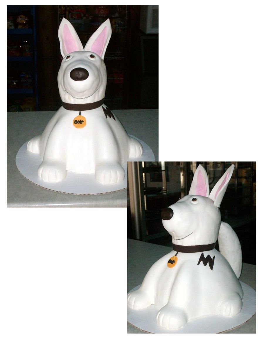 I was requested to make a Bolt cake for a girl turning 10. This is what I came up with. It it white cake done in the wonder mold pan covered with fondant. The head is a Styrofoam ball with RKT for the nose and the tail is RKT too. I had a lot of fun doing this one