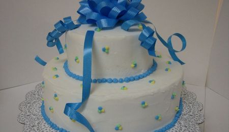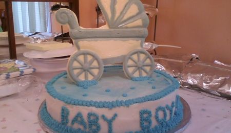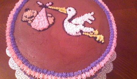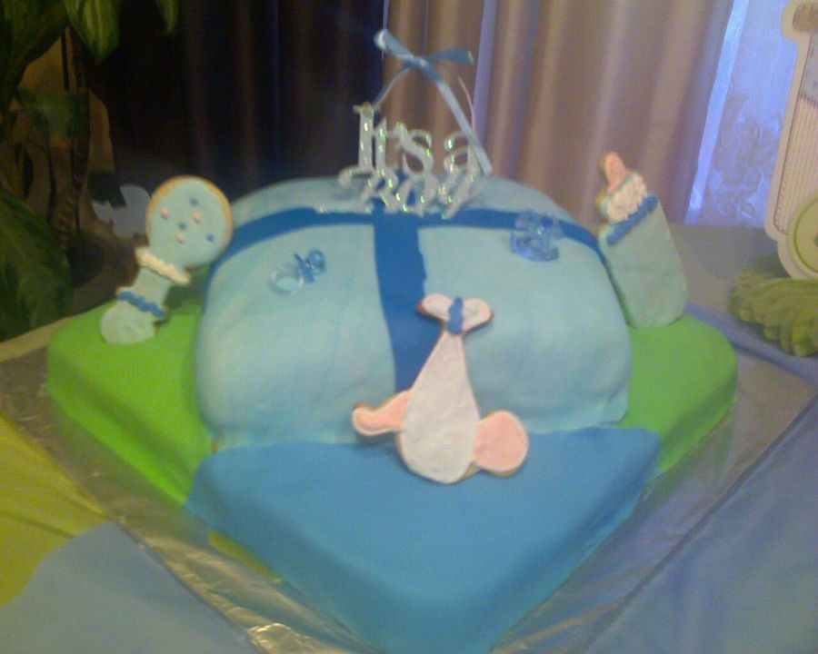 Chocolate cake covered on fondant with bottle, ratler and baby made of cookies.