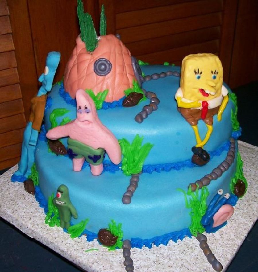 Inspired from all the wonderful Sponge Bob cakes here on CC. Thanks everyone !!! Twin girls each love sponge Bob but had to have there own cake but different... This one marble cake with MMF.