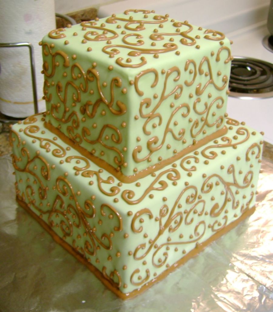 This is a dummy I made just for fun and like an experiment.Fondant color is very light sage and chocolate color scrolls.I wanted the scrolls like dark chocolate,but had no more wilton coloring gel.For the scrolls I used a mix of RI that I made and some piping gel from a recipe I wanted to try.It was a little thick but worked good,it makes perfect dots.Sorry about the bad piping.When you have a 4 yr old running around,everybody gets nervous :)