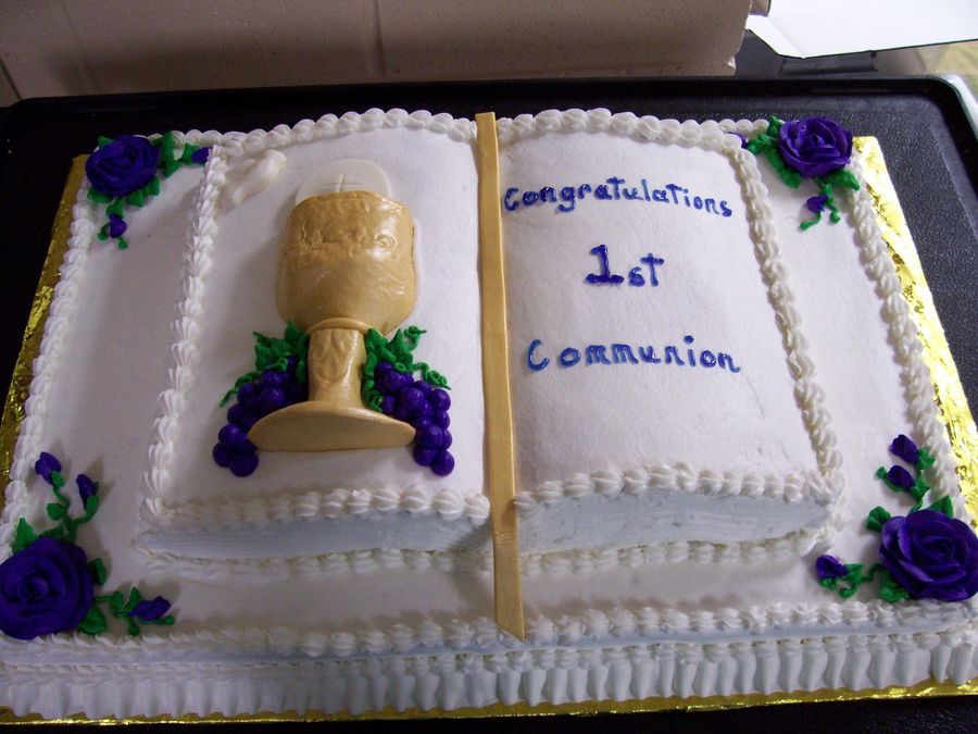 This was a First Communion cake my mother and I did for our church. It's a full sheet cake with a Bible cake on top. The chalice and host are molded by hand out of MMF. The grapes are buttercream. The bottom of the cake had the ruffle trim.