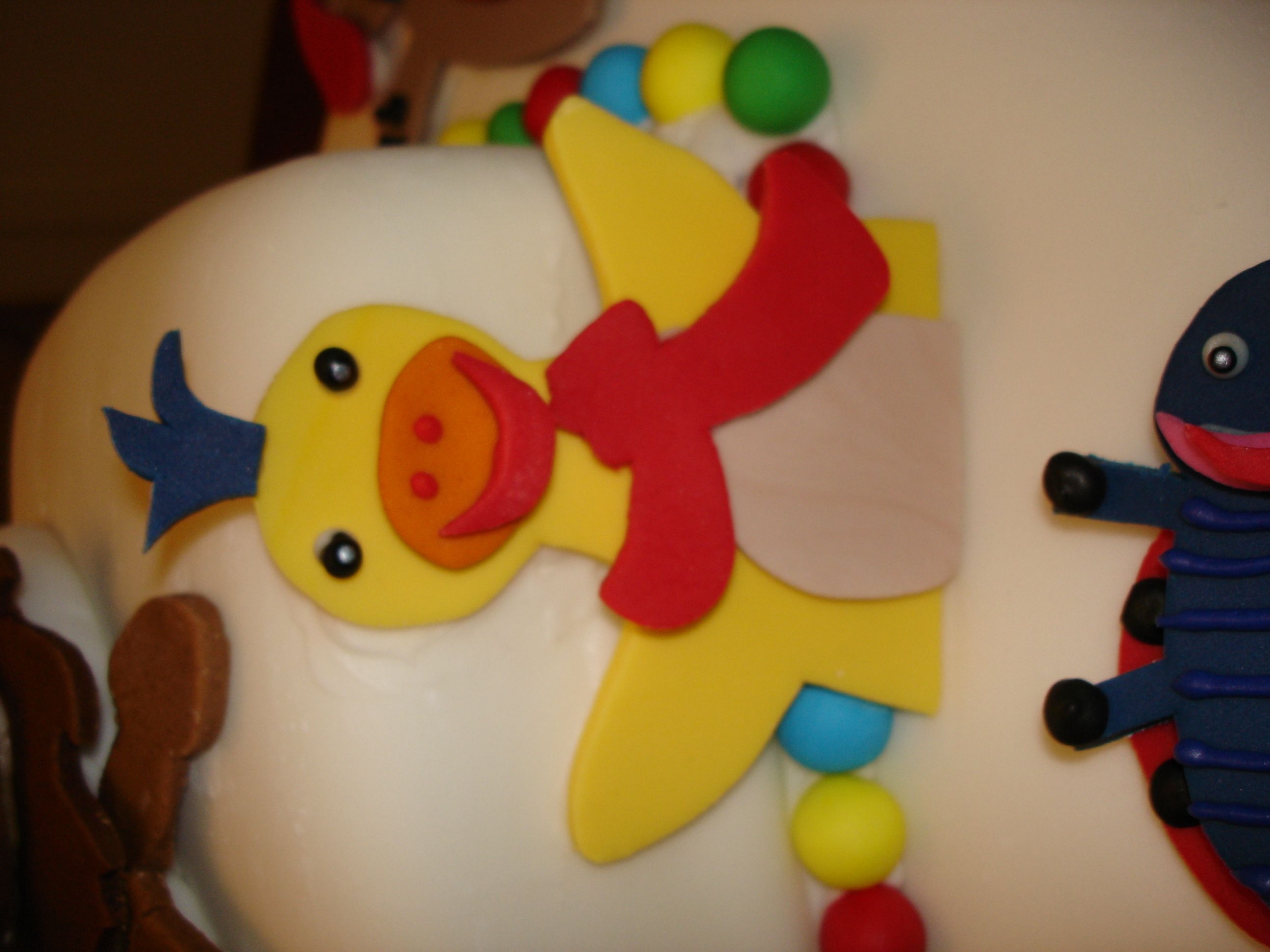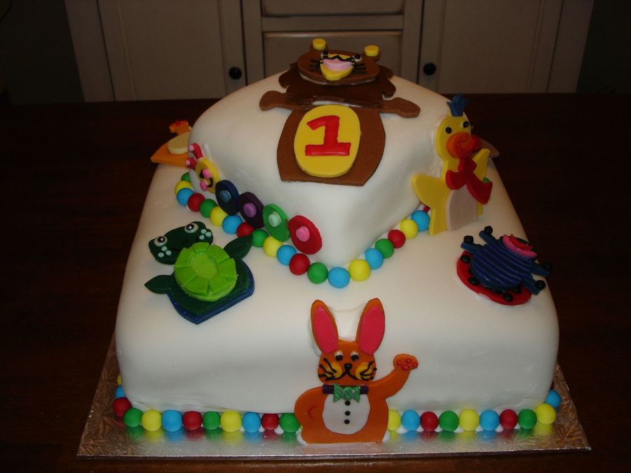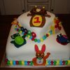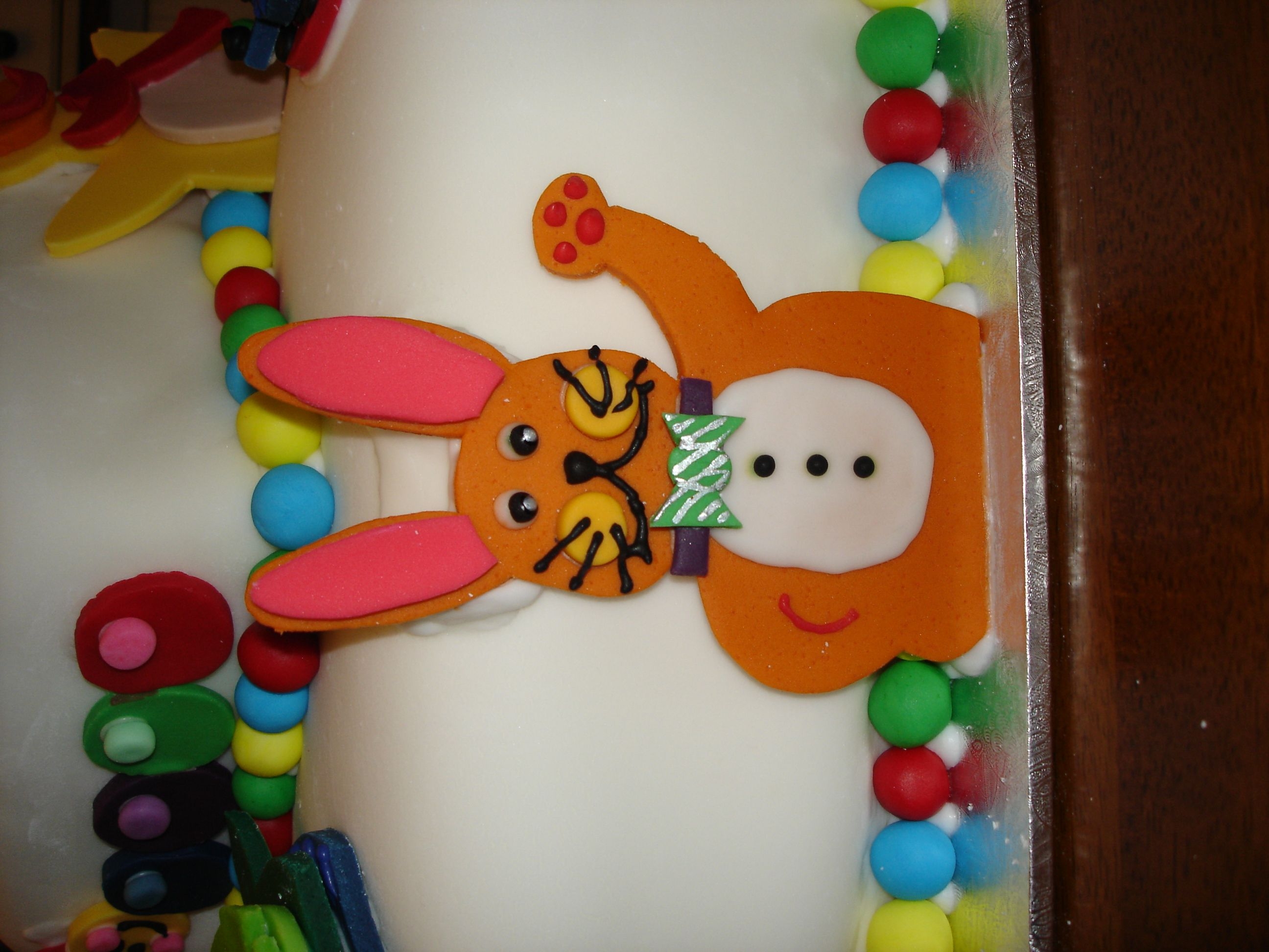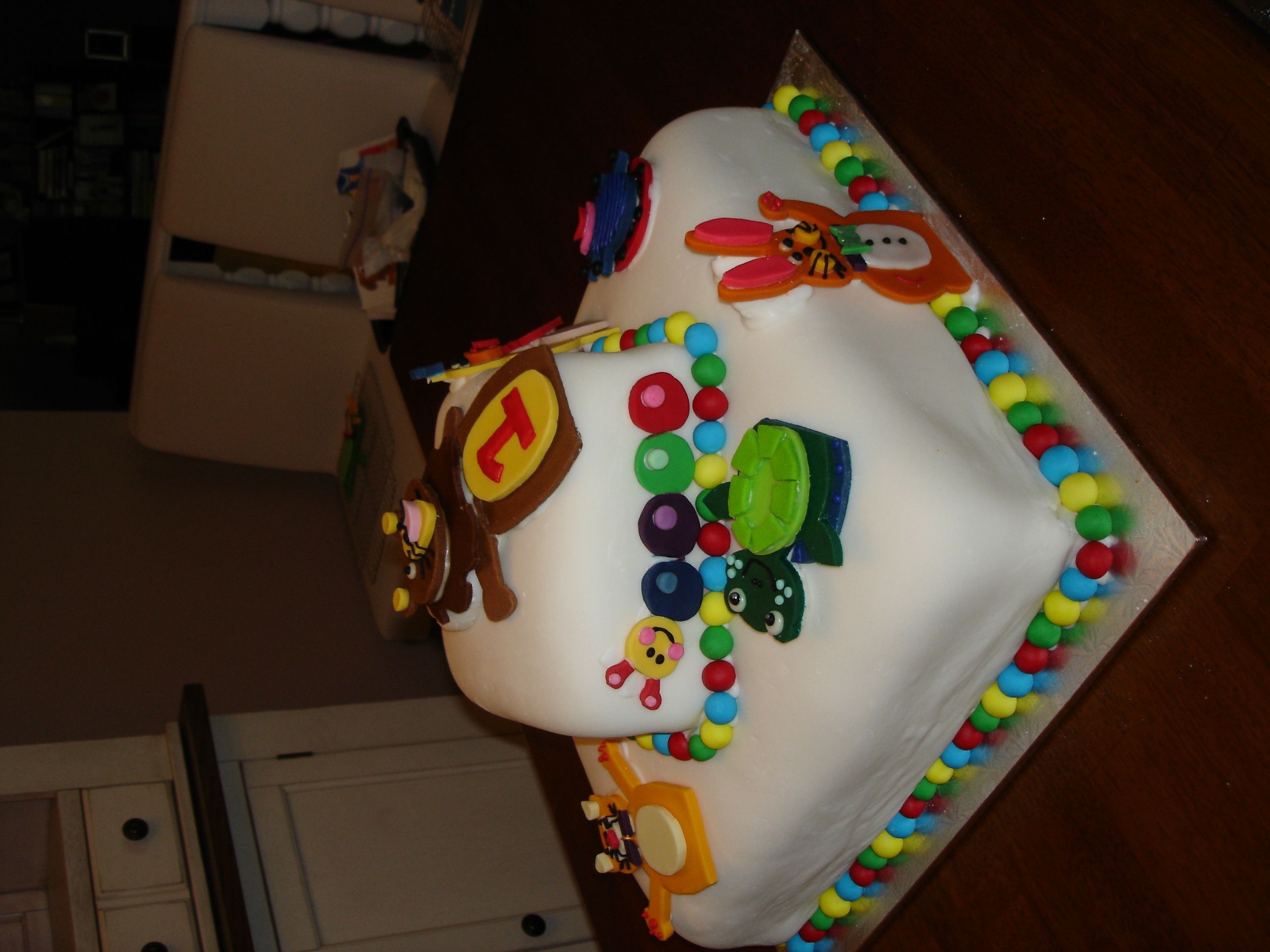This was my second fondant cake. I made it for my nephew's first birthday a few years ago. It was a white sponge cake filled with buttercream and topped with white fondant. The characters are made out of fondant (I've since learned gumpaste would have been a better option!). Thanks for looking!