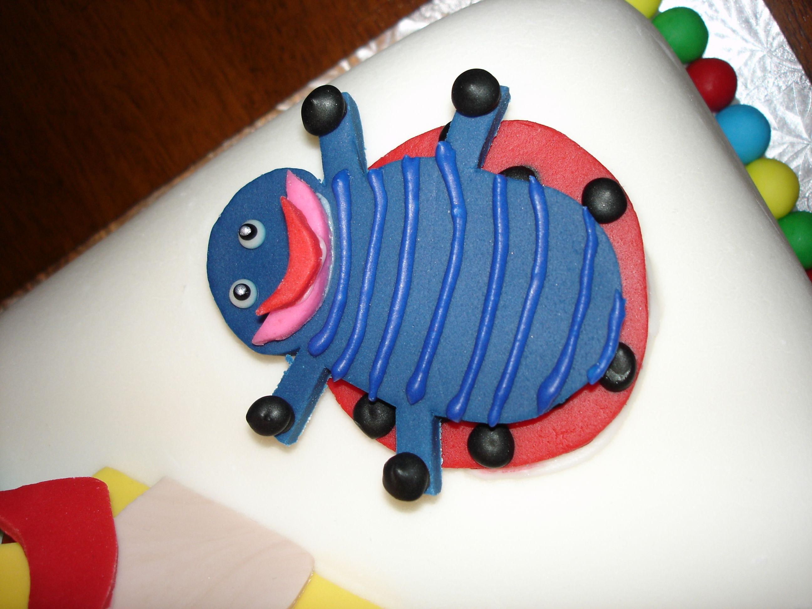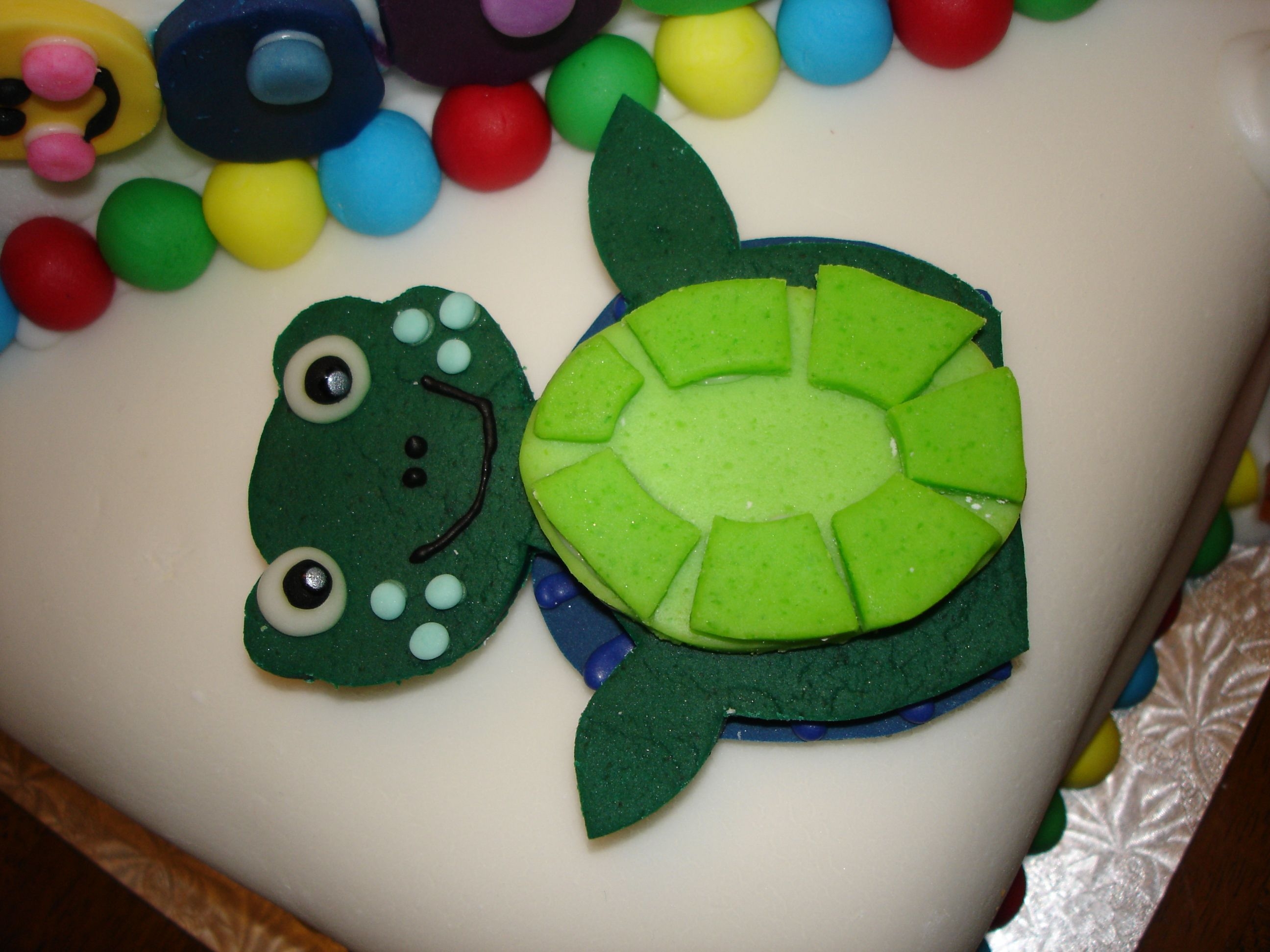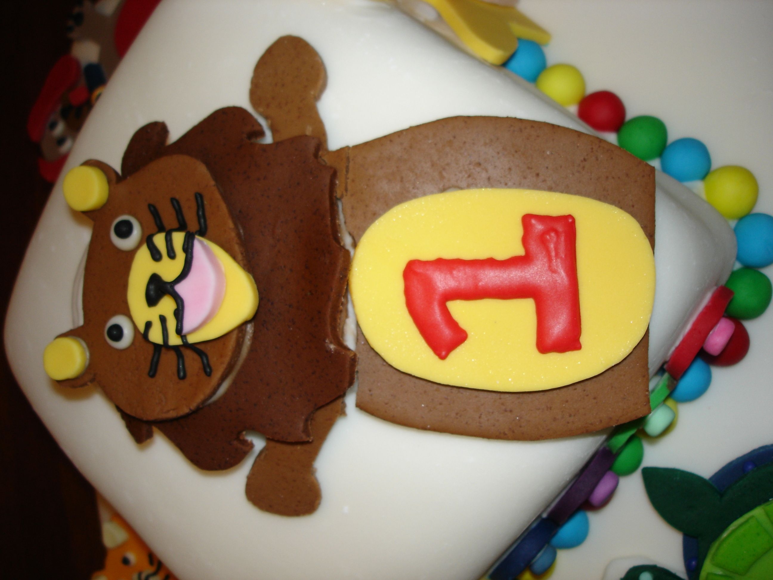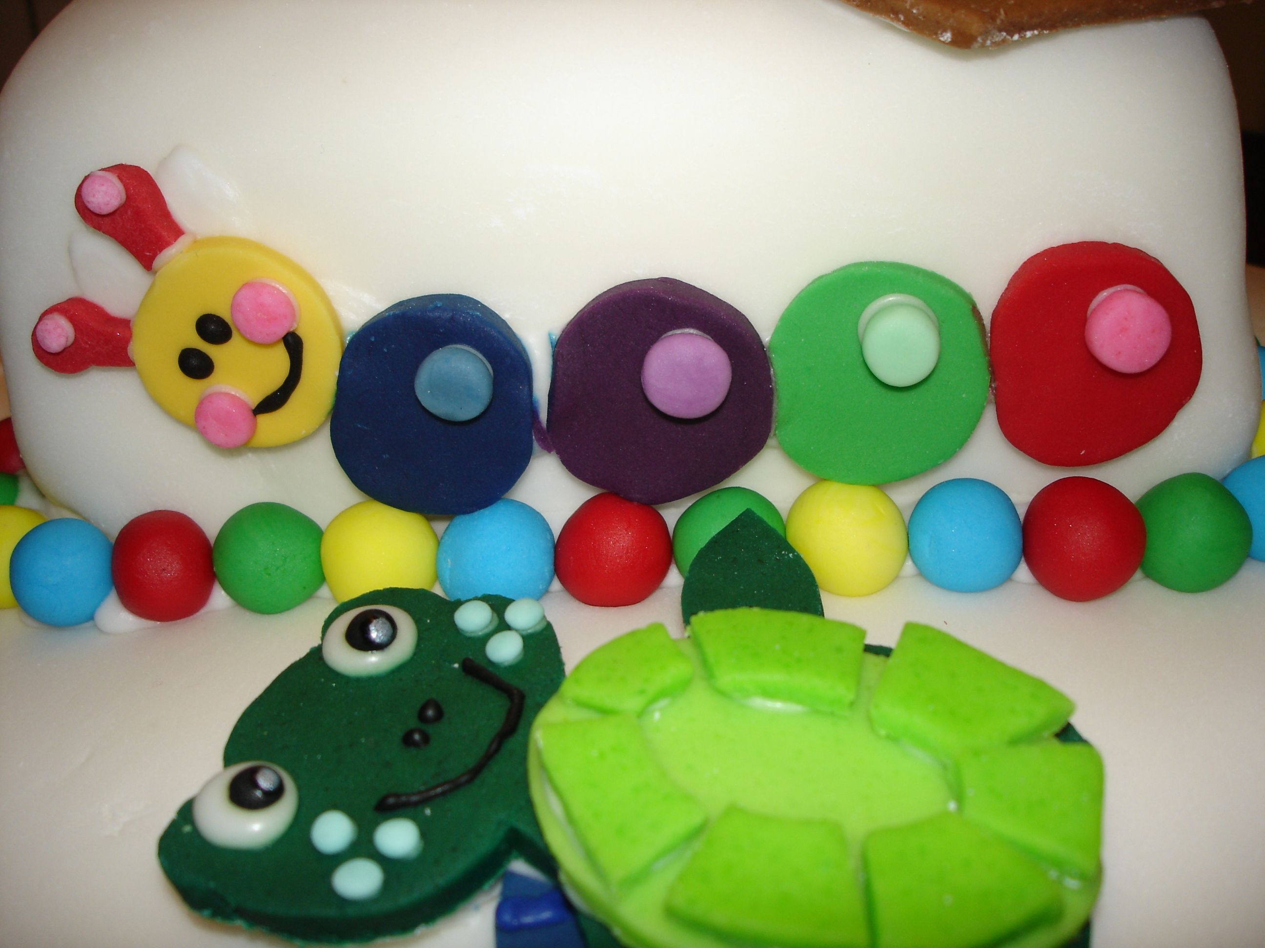 This was my second fondant cake. I made it for my nephew's first birthday a few years ago. It was a white sponge cake filled with buttercream and topped with white fondant. The characters are made out of fondant (I've since learned gumpaste would have been a better option!). Thanks for looking!