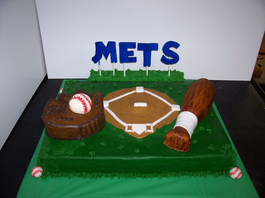 Baseball glove and ball are cake covered in buttercream. The baseball bat is also cake but it is covered in MMF and painted to give a wood-grain look. The "Mets" are gumpaste and held up with candysticks.