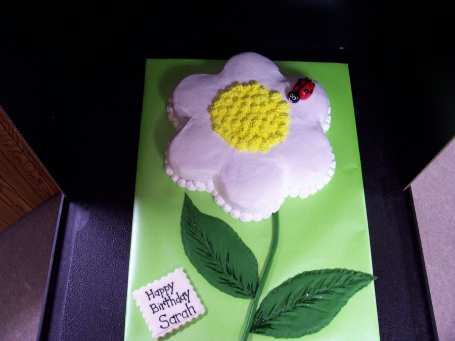 We used the daisy pan and covered with buttercream. Ladybug, flower stem, and leaves are all made out of fondant.
