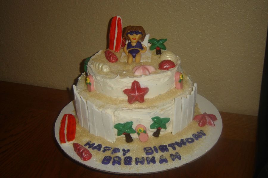 Shells, palm trees and flip flops made out of chocolate. Girl and surfboard made out of fondant.