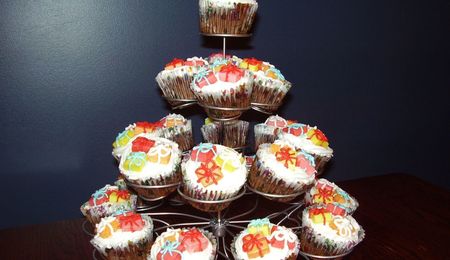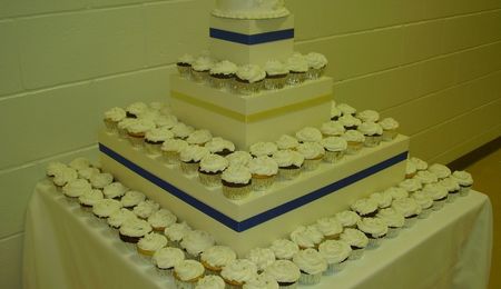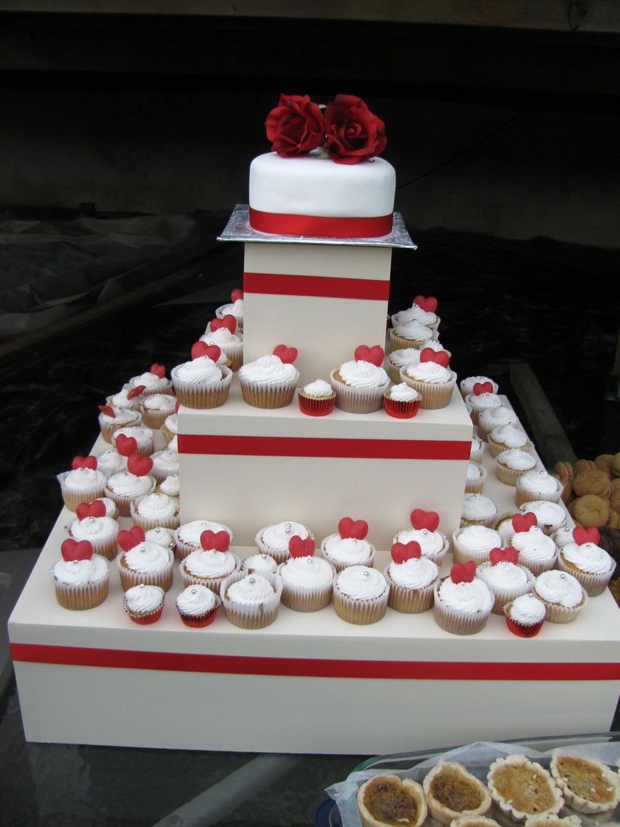 french vanilla cake and cupcakes - cake covered in fondant with silk roses on top - red chocolate hearts on the cupcakes - bride wanted a red and white theme.