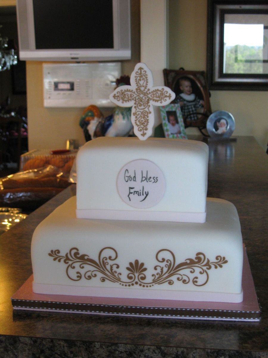 This cake was made for a little girl's confirmation to match the invitation. Covered in fondant, cross and ribbon made from fondant, fleur de lis was stenciled with royal icing. The design on the cross was free-handed.