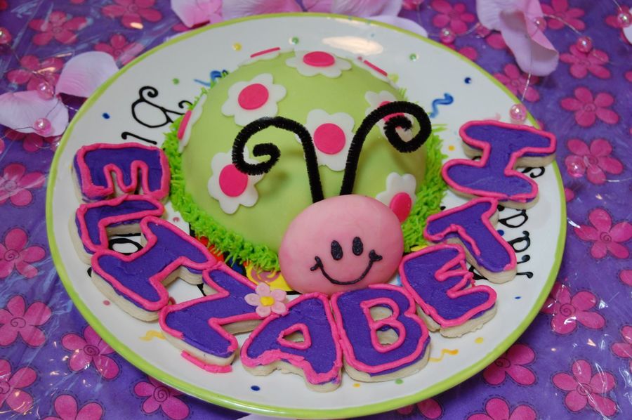 Made this smash cake for my 1 yr old. Used the ball insert on the betty crocker fill n bake cake pan. Covered the vanilla cake with buttercream and then mmf. The face is a ball of mmf and eyes & mouth are buttercream. Antennae is a pipe cleaner. The name is made out of cookies. Didn't get the picture taken until a few little hands had touched the cookies.
