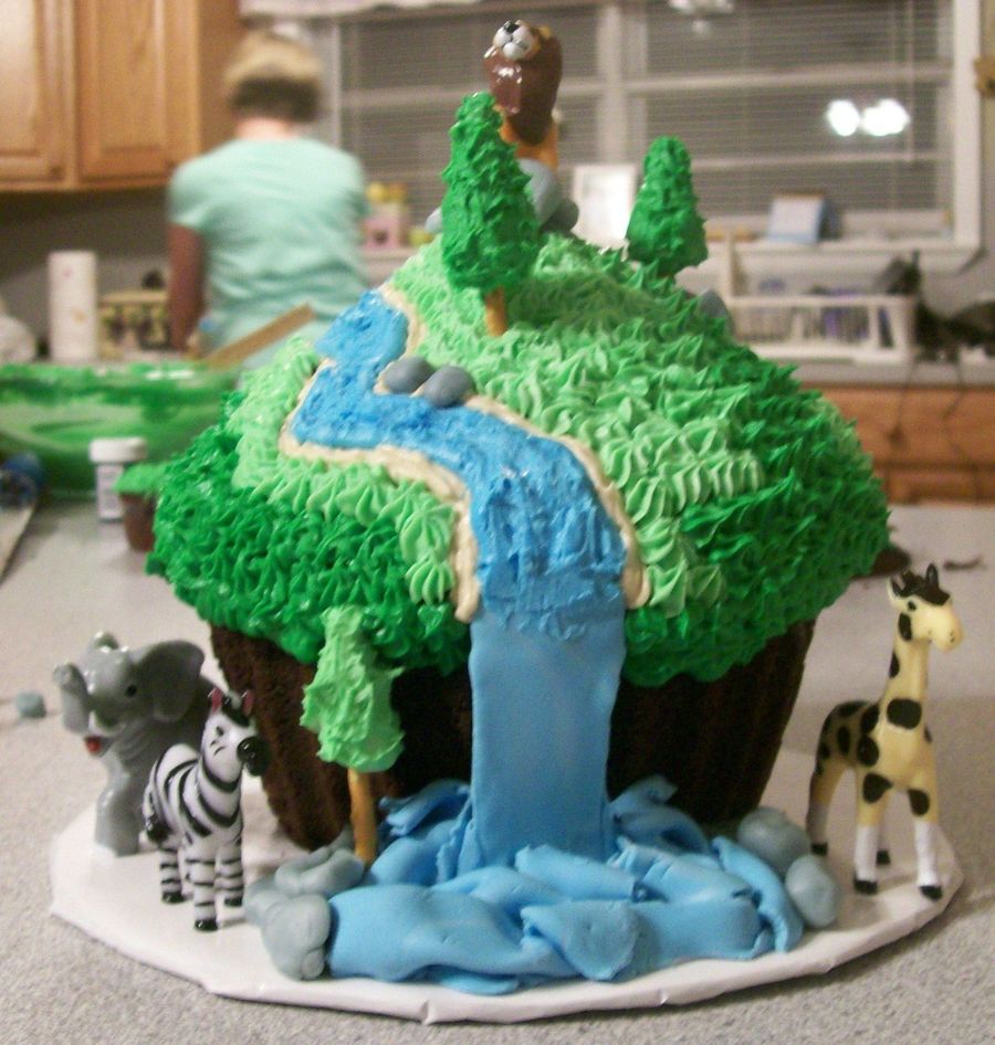 The little boy liked animals and his mom wanted a "mountain" giant cupcake, it has a fondant waterfall, and is totally edible! TFL!