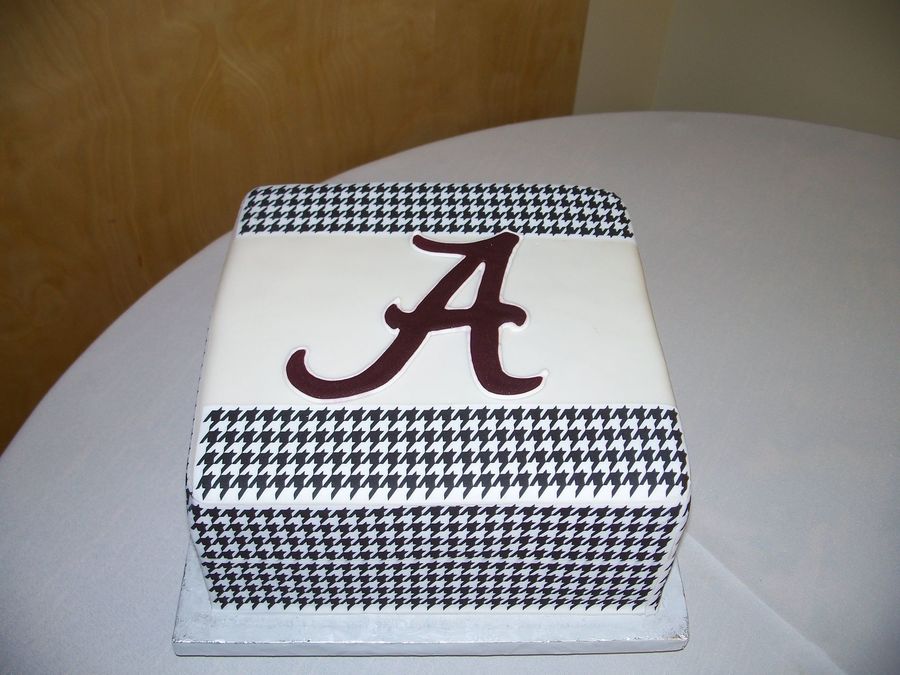 This cake was decorated using edible houndstooth image sheets. It was my first time using these sheets. You only get one chance to get it right. They were kind of tricky. The Alabama "A" was royal icing.
