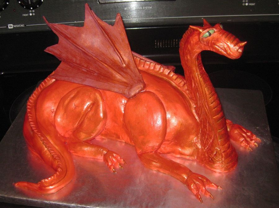 I made this dragon cake for my son who asked for a red dragon. I copied a cake I found from Mikes Amazing Cakes. I used a wreath hanger screwed to a board to support the head(I covered the entire hanger in gumpaste and made the head with gumpaste also) , the wings are sugarveil and the dragon is covered in fondant painted with a sheen airbrush paint. Thanks for looking :)