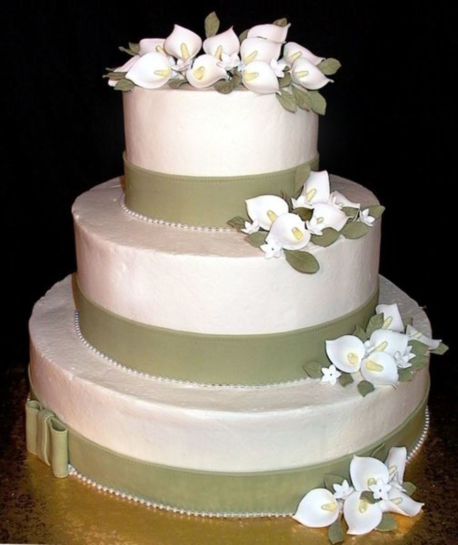 This cake is iced in butter cream with fondant ribbon. The cala lilys are gumpaste. TFL