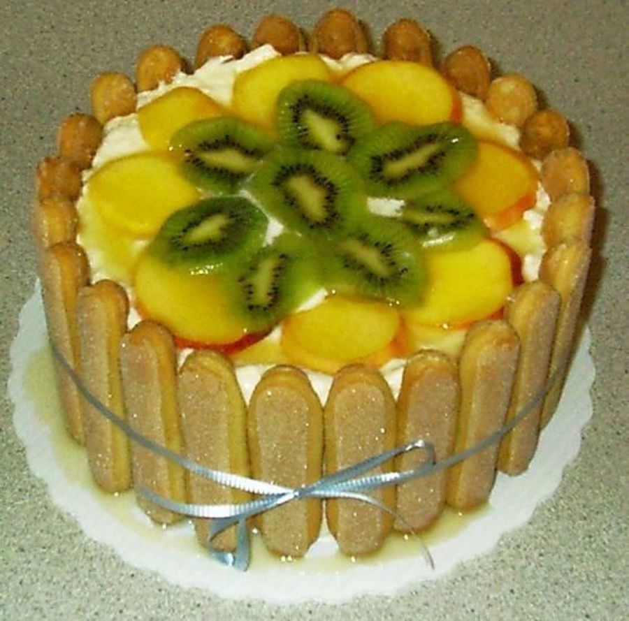This is what we know in PR as a "charlota". Regular 2-layer yellow cake with Bavarian cream/cream cheese frosting, surrounded with ladyfingers and topped with fresh fruits.