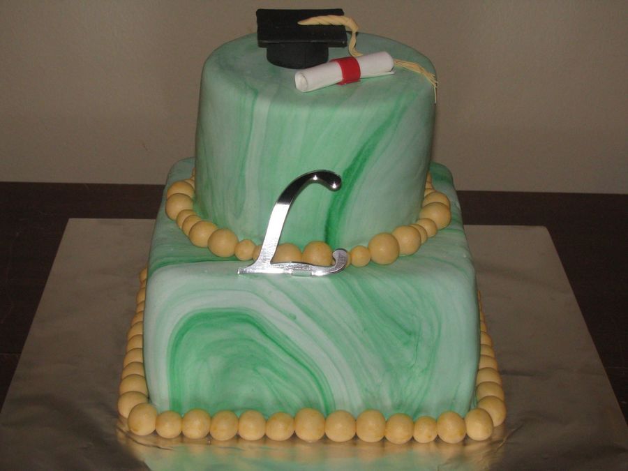 I marbled the fondant with green and made a gold fondant border in the school's colors. The cap and diploma were made in fondant as well. For the tassel I used a clay gun. The sizes are 8" square and 6" round.