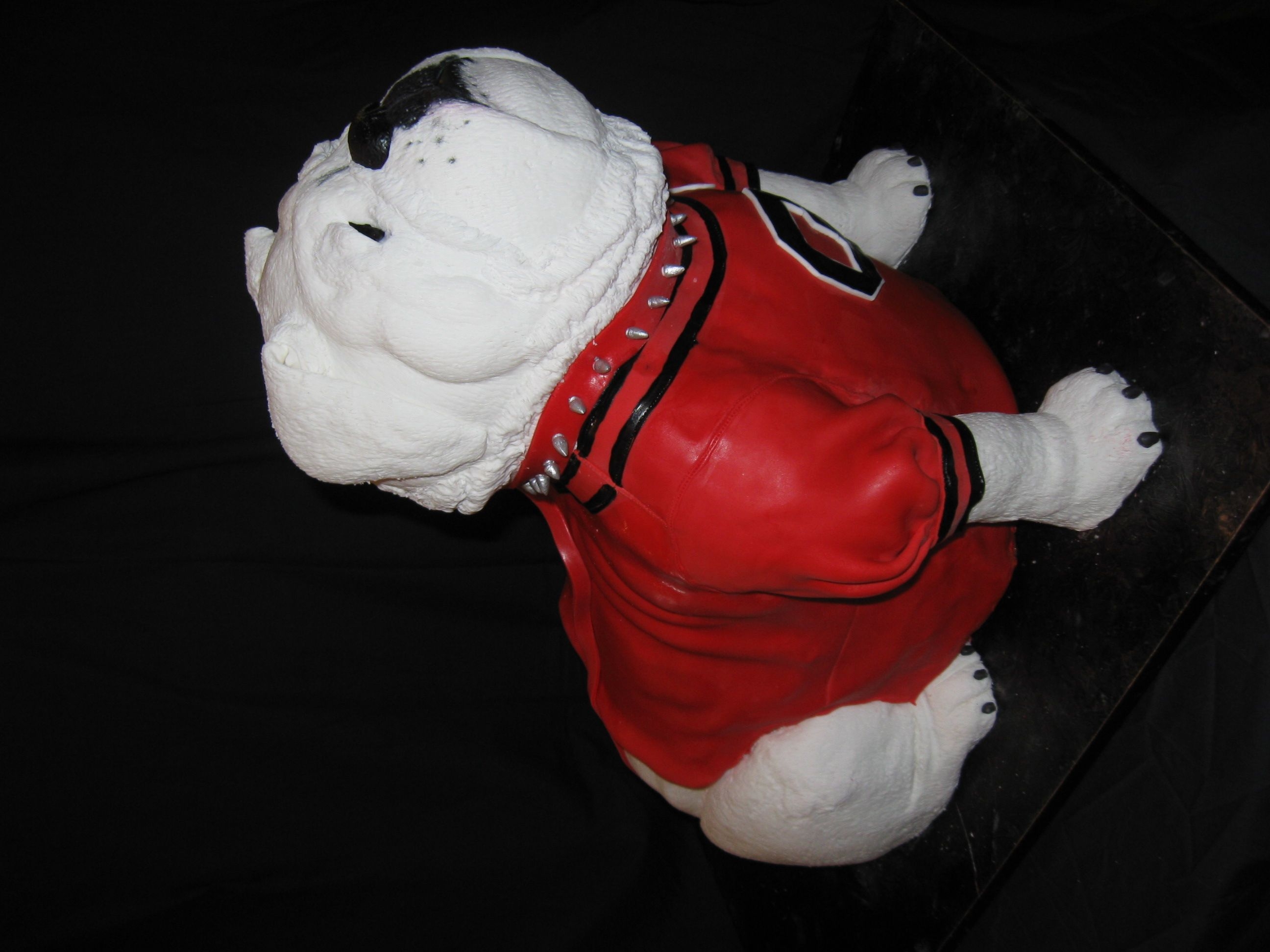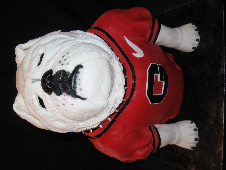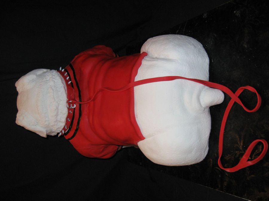 The internal structure was only in the very front of the dog. PVC Pipe ran from the left leg, across the chest, down the right leg. It also had a "T" in the middle of the chest with a small piece of pipe to attach a small styrofoam ball for the head. Then, I used modeling chocolate to sculpt the head and the chest and the legs. The body is cake. And then it's all covered in chocolate. I also took an exacto knife and scored hair on his body. That took a loooooong time but it looked awesome.
